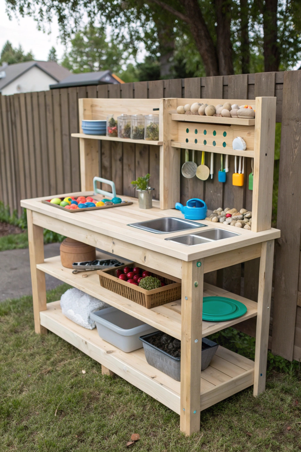 An outdoor table equipped with shelves enhances your mud kitchen by providing organized storage for tools, toys, and natural ingredients. This practical addition keeps play materials within easy reach, encouraging children to explore and create without interruption. Its sturdy construction ensures it withstands the rigors of outdoor use.
