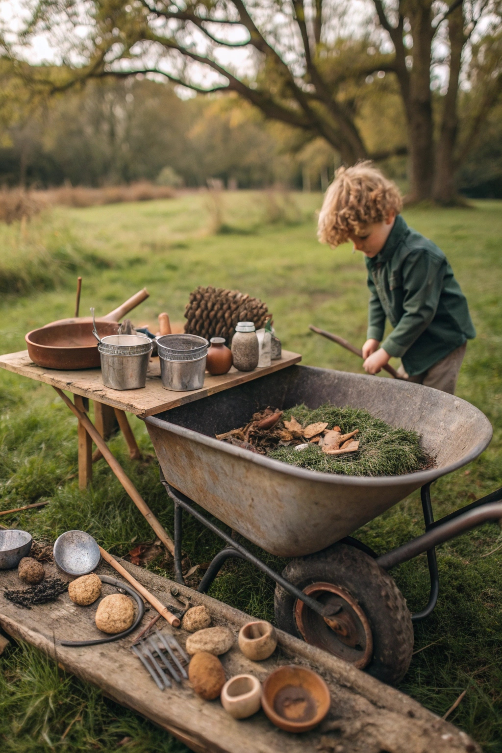Repurpose a wheelbarrow into a dynamic mud play station filled with creative tools like old pots, pans, measuring cups, and natural decorations such as leaves and twigs. This mobile setup invites children to craft unique mud masterpieces, fostering imaginative play and fine motor skills development.