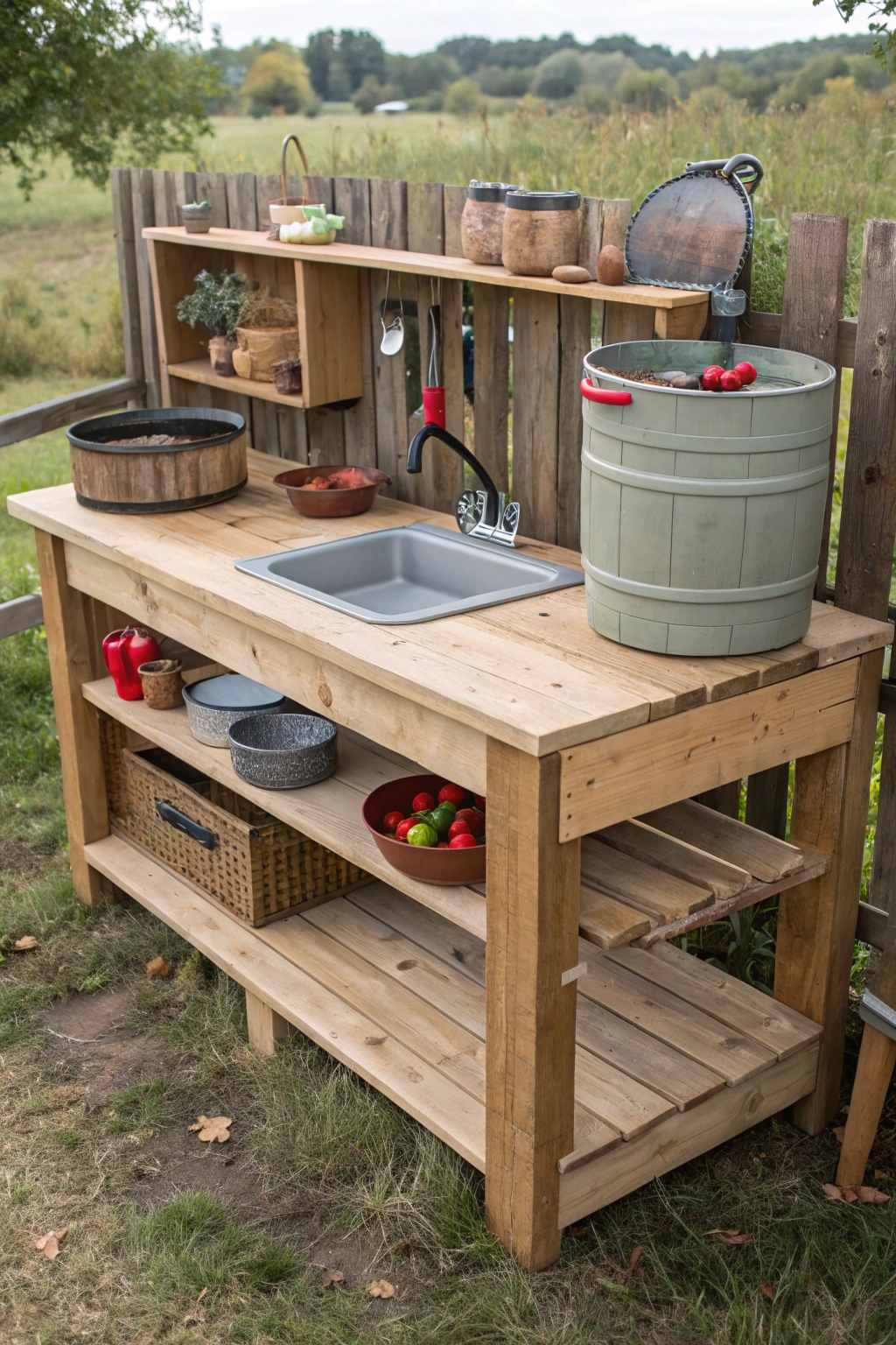 Introduce rustic charm with a farmhouse sink as the centerpiece of your mud kitchen. Pair it with wooden benches and countertops, and equip the space with old pots and pans for mud pie making. This setup encourages imaginative scenarios and hands-on play, blending functionality with aesthetic appeal.