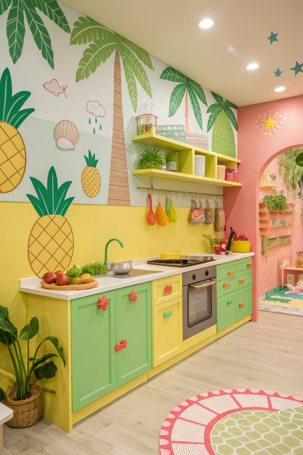 Bring a splash of the tropics to your backyard with a mud kitchen painted in lively greens, yellows, and pinks. Decorate with beach-themed accents like seashells and palm leaves, and surround the area with tropical plants for authenticity. Fun utensils shaped like fruits add a playful touch, inspiring imaginative culinary adventures.