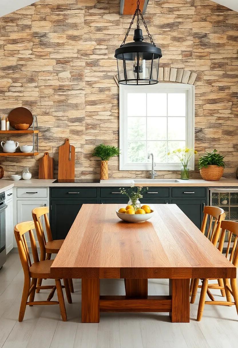 Add a Farmhouse Table – A large, inviting table can create a communal gathering space, harmonizing with the rustic background