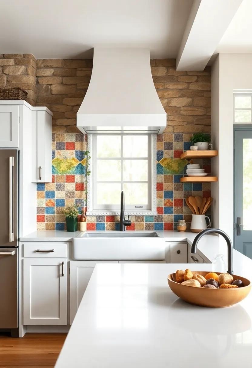 Colorful Backsplash Tiles - Use colorful tiles in the backsplash to add a fun, vibrant contrast to the muted tones of stone walls