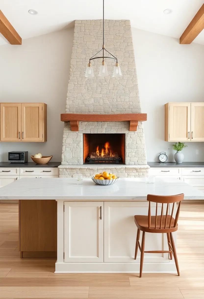 To enhance the visual appeal of your space, consider framing the fireplace with reclaimed wood beams that draw the eye upwards. This combination of materials creates a distinct focal area that invites relaxation and conversation. Additionally, you can dress up the mantel with seasonal decor—think fresh herbs in terracotta pots or a collection of vintage cookbooks—that complements the stone’s natural beauty. Take advantage of lighting techniques as well; subtle sconces on either side of the fireplace can illuminate both the stonework and the unique features of your kitchen.
