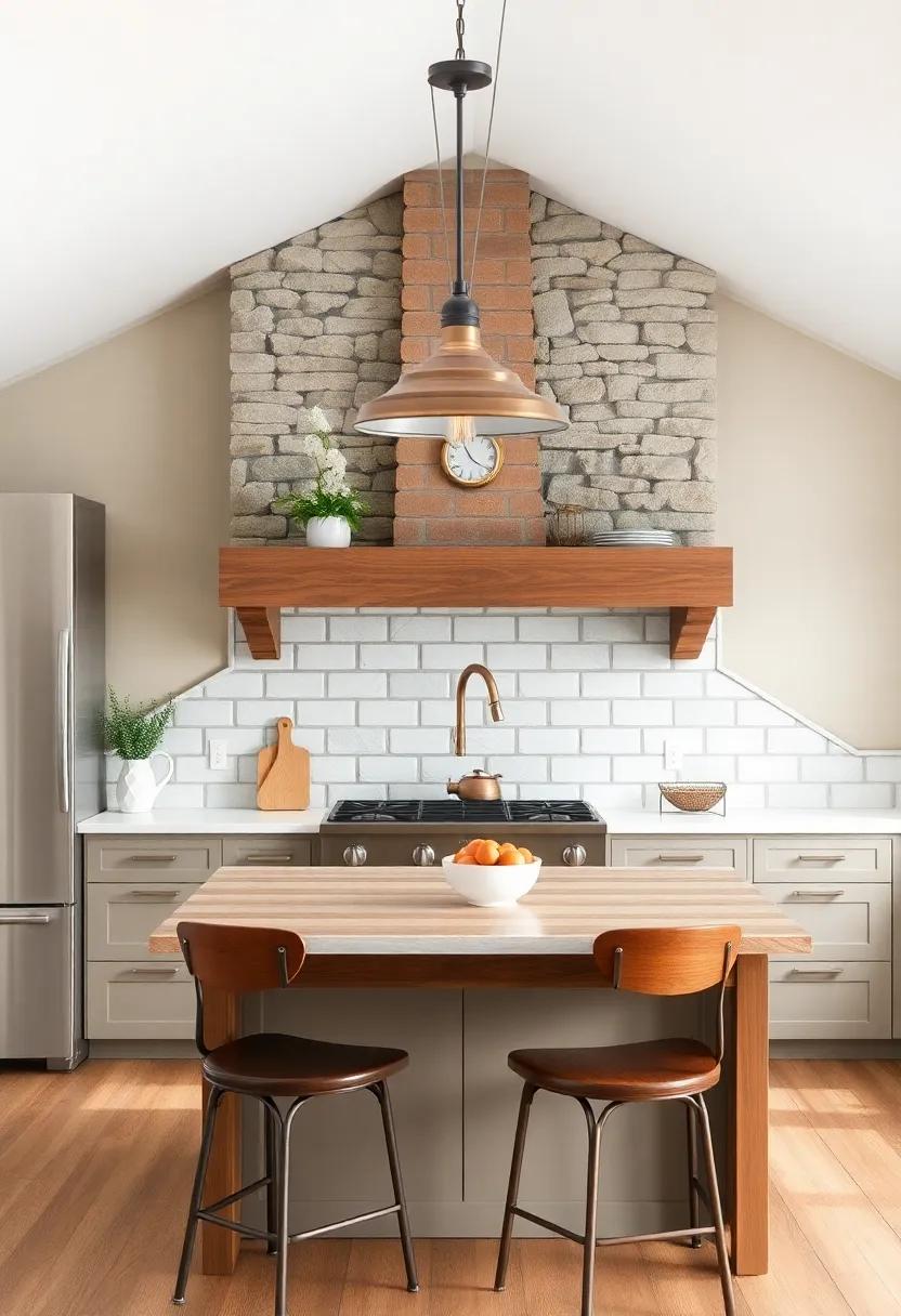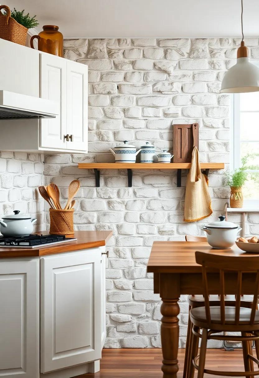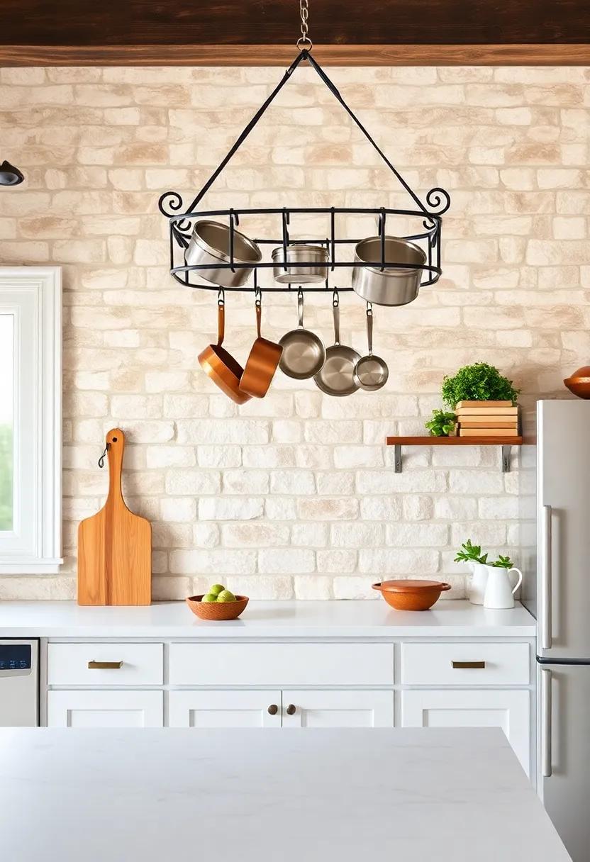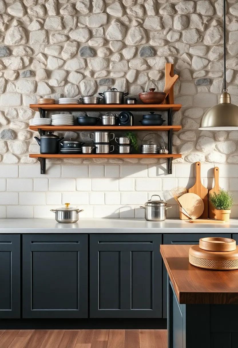 If you want to highlight your cookware while complementing the rustic charm of stone walls, consider using a decorative ladder or display shelves as elegant focal points. these versatile pieces not only add a unique design element, but also provide practical storage solutions. Positioning a vintage ladder against the wall can give you the opportunity to showcase your favorite pots and pans, allowing their colors and designs to pop against the textured backdrop of stone. Adorn the rungs with hanging herbs or spice jars to combine functionality with a delightful aesthetic, creating a natural, earthy vibe in your kitchen.