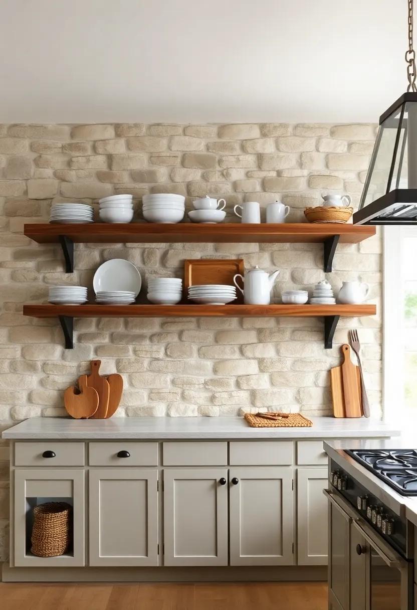 Open Shelving for a Cozy Touch – Use open shelves made of reclaimed wood to display vintage dishware against the robustness of stone