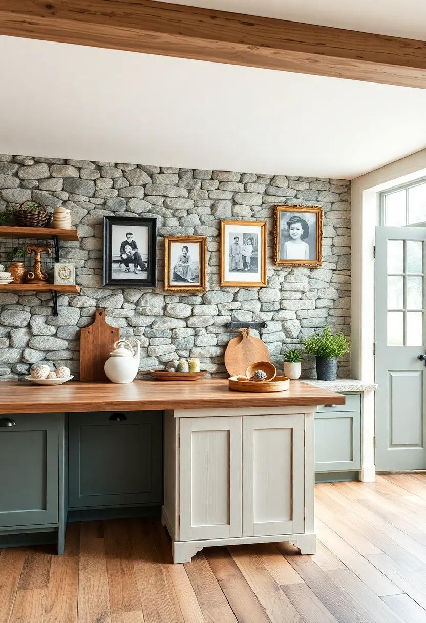 This thoughtful incorporation of vintage fixtures can significantly elevate the charm of your farmhouse kitchen, perfectly complementing the stone wall features while echoing a timeless story.