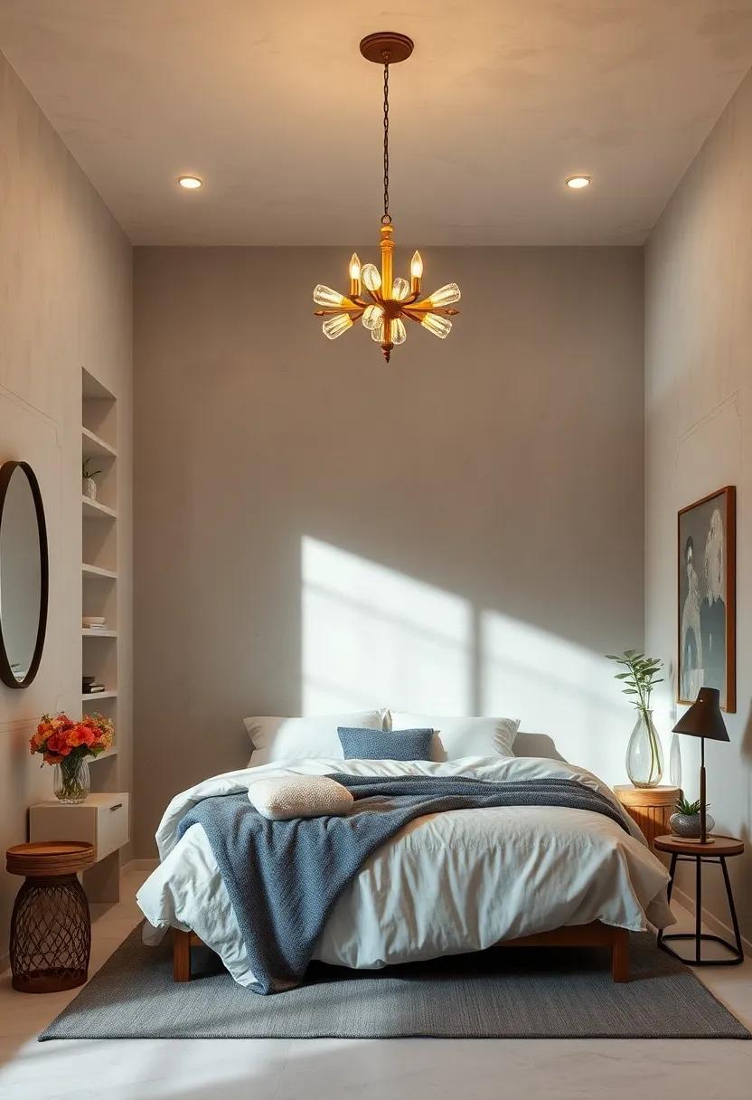 Consider elevating your small bedroom with the bold choice of a minimalist chandelier that integrates seamlessly into your decor while offering a captivating focal point. Such a statement piece not only enhances the aesthetic but also plays with light and shadow, enriching the ambiance without overwhelming the space. Choose designs that emphasize clean lines and understated elegance to maintain a harmonious balance. Some designs might feature: