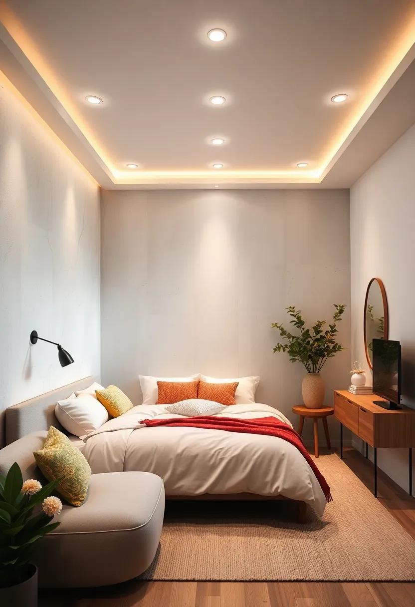 Transform your small bedroom into a harmonious retreat with a series of carefully positioned ceiling-mounted lights that create a beautiful interplay of shadows and illumination.These small fixtures can be arranged in various configurations to not only provide adequate lighting but also enhance the room’s aesthetics. Consider incorporating a mix of styles—such as minimalist, industrial, and modern—to produce a chic layered effect that reflects your personal taste while maintaining a sense of coherence.