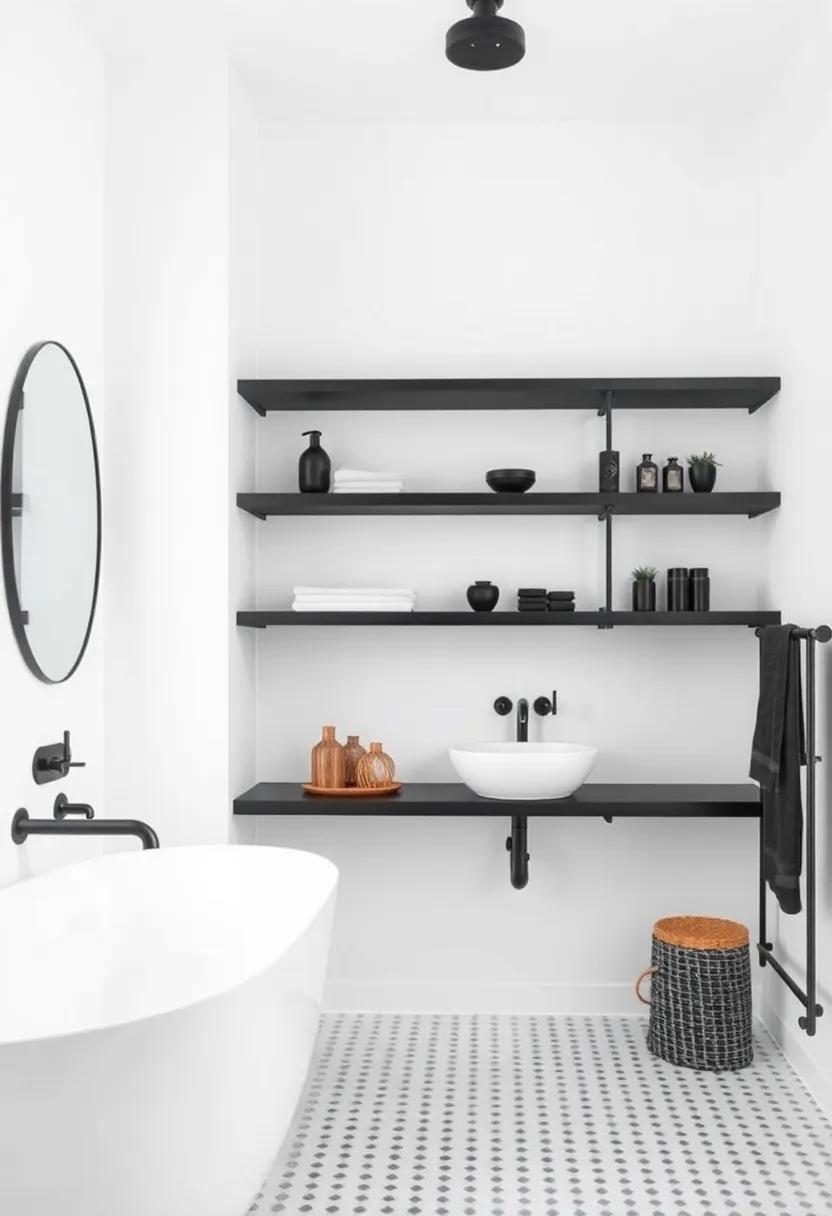 When arranging your floating shelves,think about layering and varying the height of items for visual interest. incorporate pieces with contrasting materials, such as ceramic or glass vases, to add depth against the matte black backdrop. You can also utilize these shelves to emphasize your individual style by choosing personal treasures or thematic decor that resonates with your bathroom’s overall vibe. Remember,the goal is to keep the look intentional and not overcrowded,preserving that chic,curated feel that matte black shelving effortlessly brings to the space.
