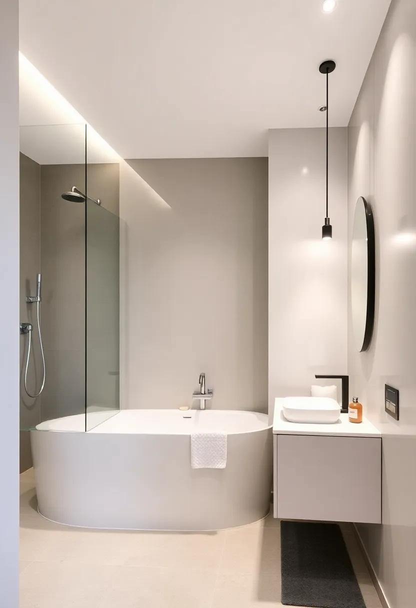 To further elevate your minimalist bathroom, explore fixtures with refined materials such as matte metal or frosted glass. These materials add a touch of sophistication while maintaining that essential understated charm. Pairing these fixtures with neutral color palettes allows for a cohesive, tranquil surroundings. When selecting lighting, think about functionality too; dimmable options can adjust the mood for relaxing baths or energetic mornings, making your space not just stylish but also practical. Ultimately, the beauty of minimalist lighting lies in its ability to enhance the overall design ethos without overwhelming the eye—creating an inviting retreat in your ensuite.