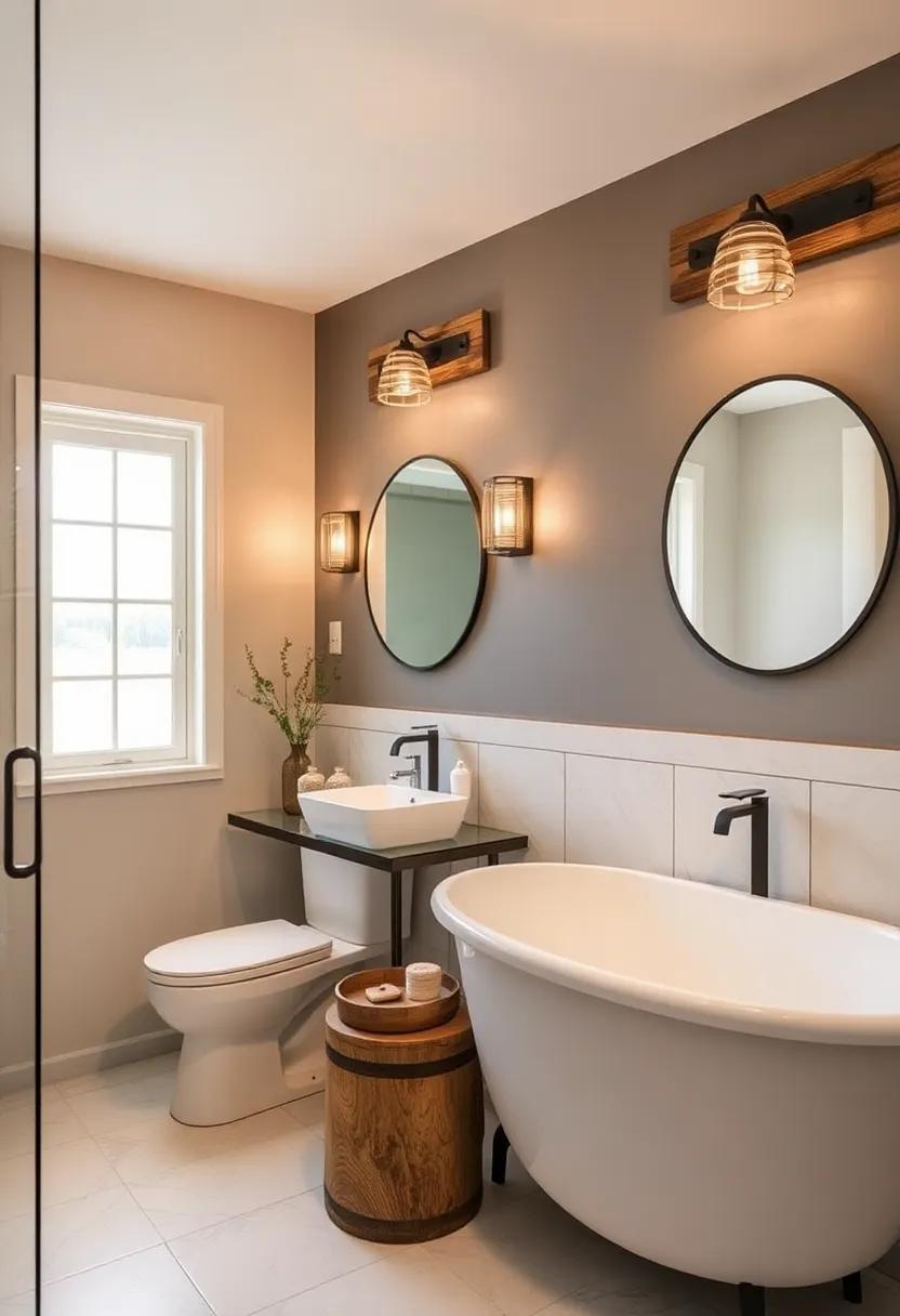 Transform your ensuite bathroom into a cozy retreat by incorporating rustic lighting features that evoke warmth and charm. Consider wrought iron fixtures—these come in a variety of styles, from sleek and modern to ornate and vintage. Their robust texture and dark finish complement softer materials, creating a beautiful balance that enhances your space’s rustic appeal. Additionally, reclaimed wood accents serve as amazing statement pieces; think about suspended lighting made from salvaged beams or a rustic ladder used to hang stylish pendant lights. Such elements not only light up your bathroom but also tell a story of sustainability and craftsmanship.