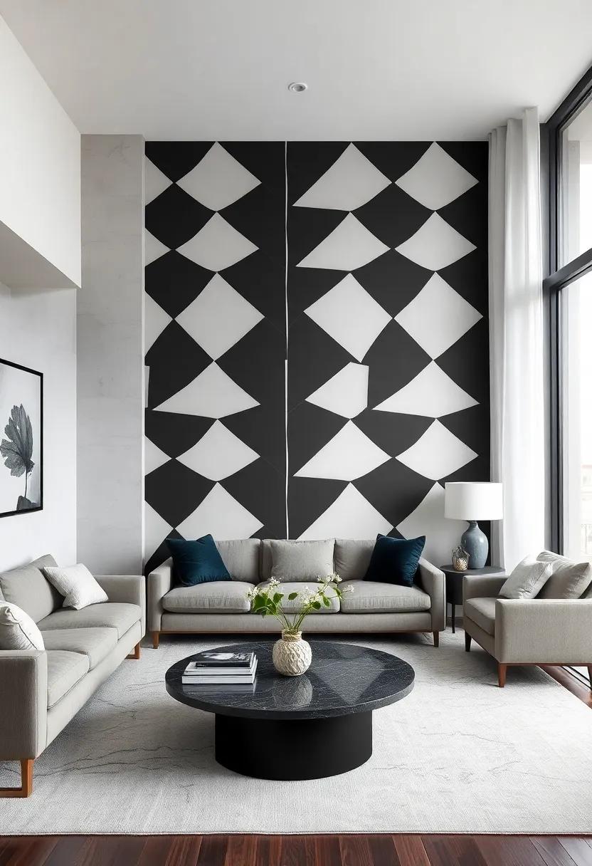 Minimalist Monochrome: A sleek black-and-white geometric wallpaper serves as a sophisticated backdrop, emphasizing clean lines and modern furniture