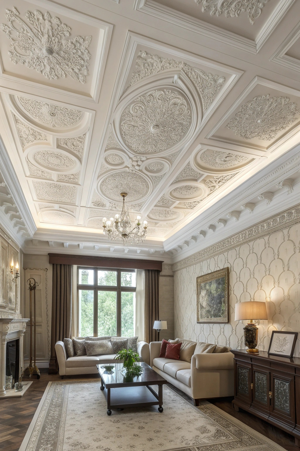 Elevate your living room’s sophistication with decorative ceiling treatments that captivate the eye. Consider options like: