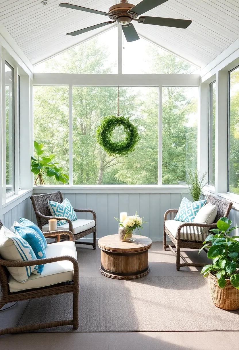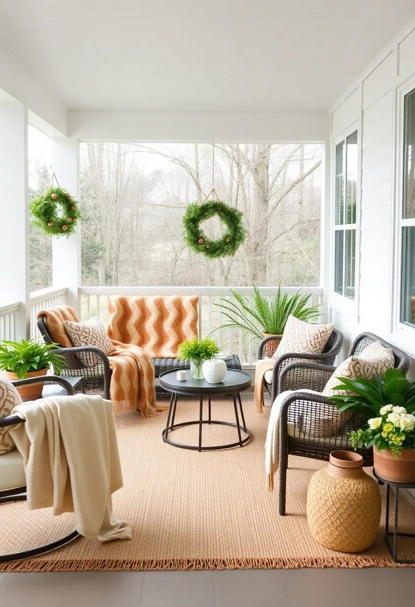 Along with wall colors, your choice of furniture and decor can further enhance this tranquil ambiance. Opt for cushions and throws in light blues, soft grays, and other muted shades to encourage relaxation. Incorporating plants with calming greens can connect your porch to nature, adding to the peaceful vibe. Complement these hues with soft, natural fibers and textures to maintain a cohesive look that invites you to unwind.
