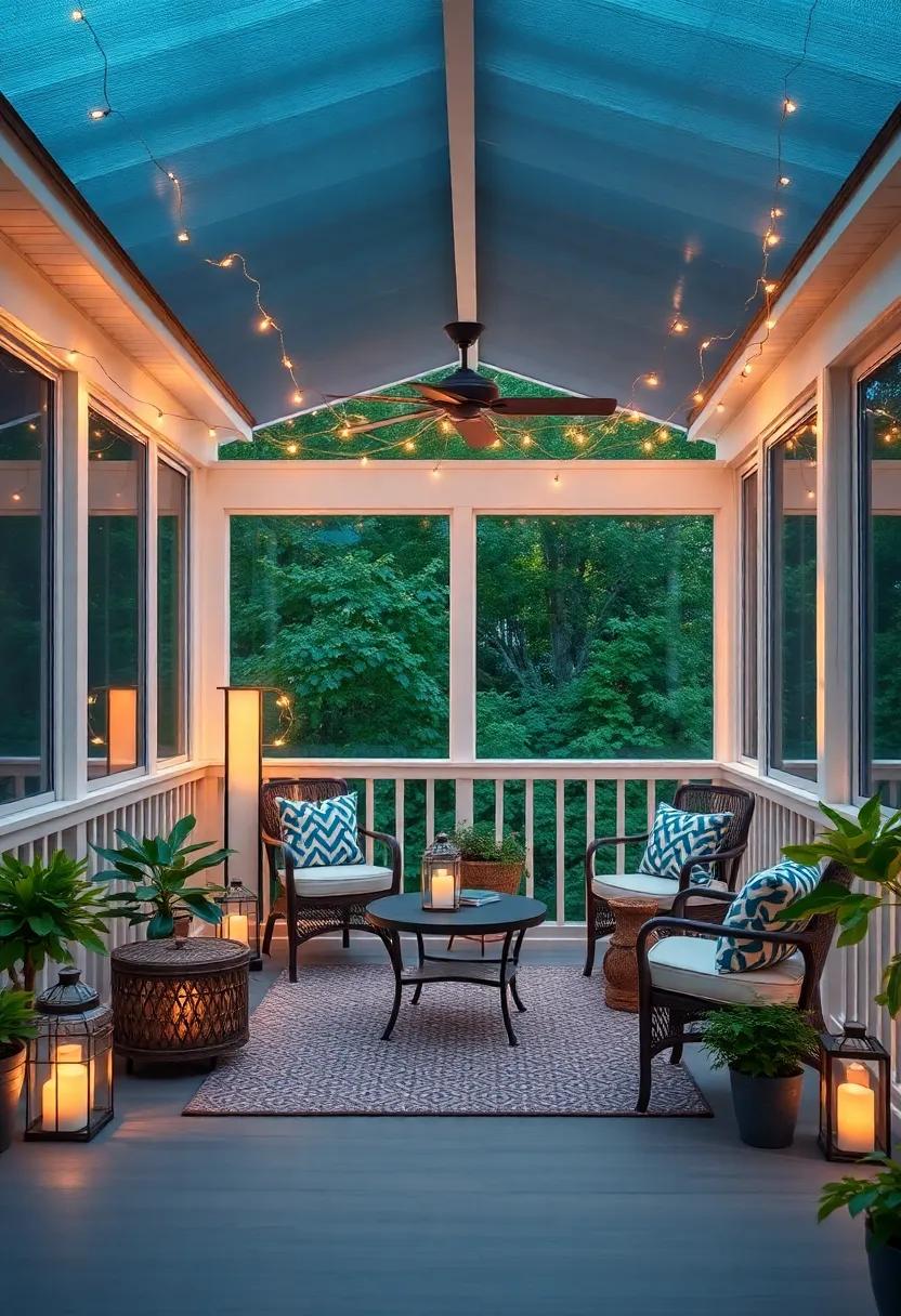 Transform your screened porch into a sanctuary by adorning it with delicate fairy lights and charming lanterns. These enchanting elements not only illuminate your space but also weave a spell of calmness. Hang strings of fairy lights along the beams or drape them gracefully across the railings, creating a starry effect without the need for the night sky. Choose lanterns of varying sizes and materials—think rustic wood or polished metal—and scatter them on tables or lines of the porch. This layered lighting will cast a cozy, inviting glow that encourages relaxation and adds a touch of magic to your evenings.
