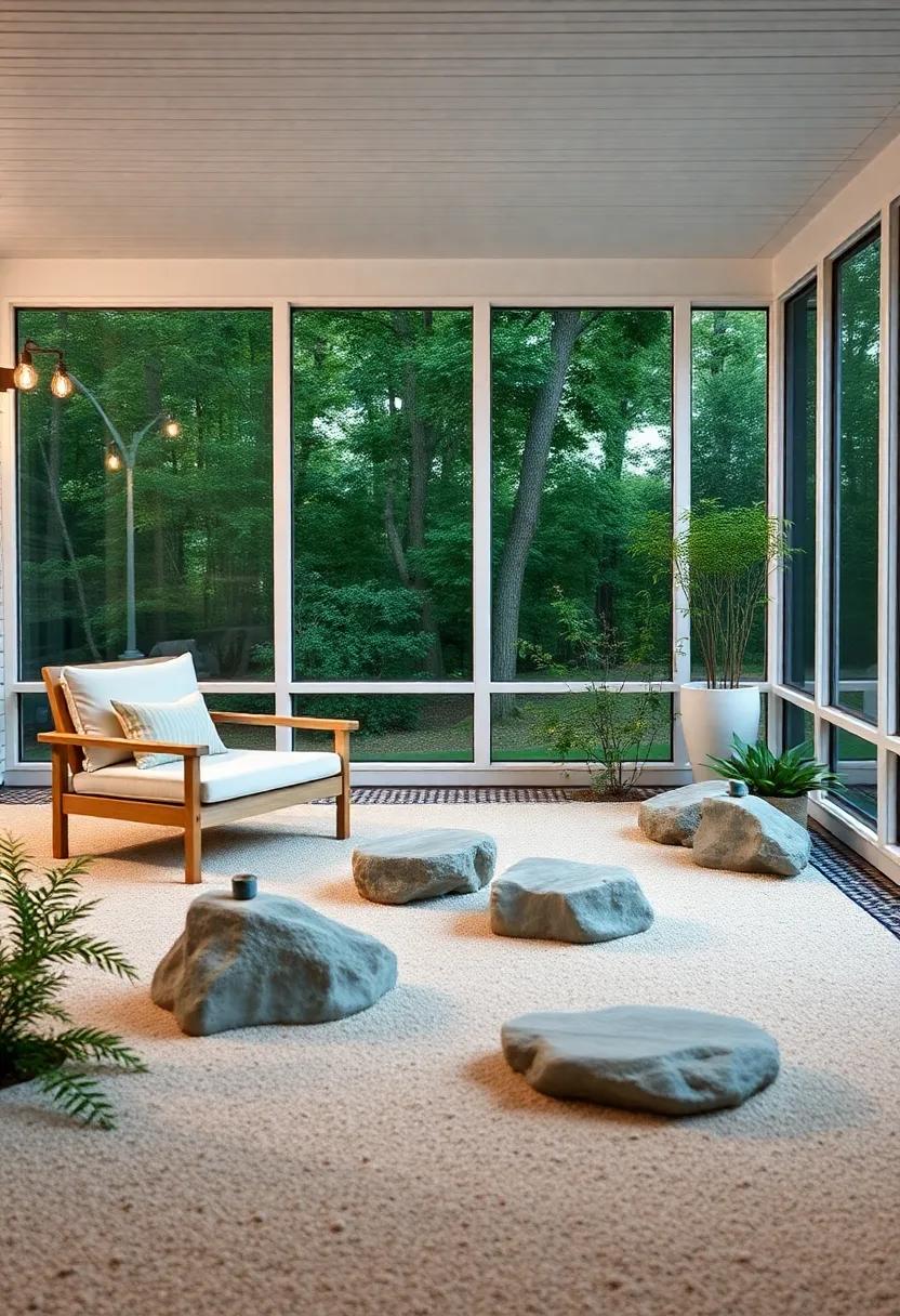 Transform a corner of your screened porch into a personal oasis by integrating a small sand or rock garden, inviting an element of nature that speaks to the soul. A Zen garden can serve not just as a visual centerpiece but also as a meditative tool, allowing for moments of quiet reflection amidst your daily hustle. To create this serene space, consider using fine sand or small pebbles arranged in gentle ripples or geometric patterns, symbolizing flowing water or the natural landscapes that inspire peace.