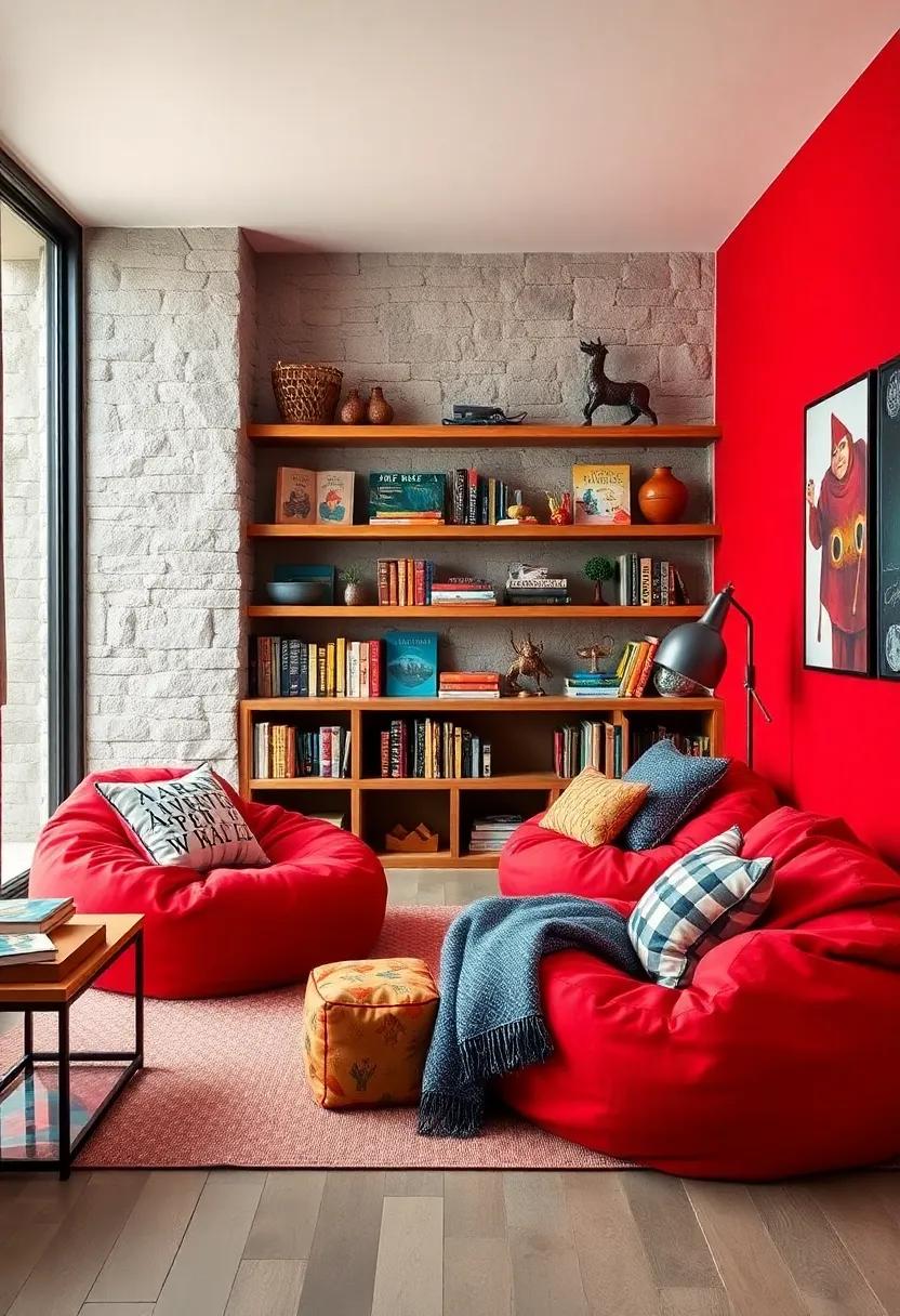 Create a reading nook with oversized red bean bags and whimsical shelves showcasing adventure books