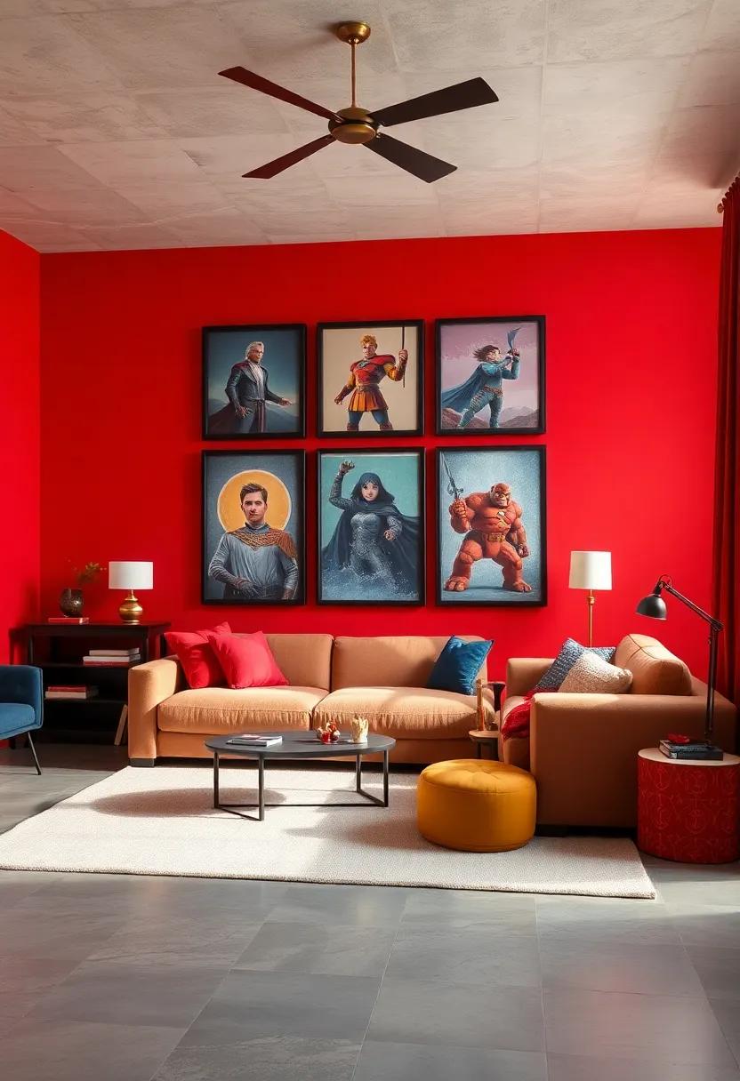Create a gallery wall with framed art prints representing heroic characters and exciting journeys