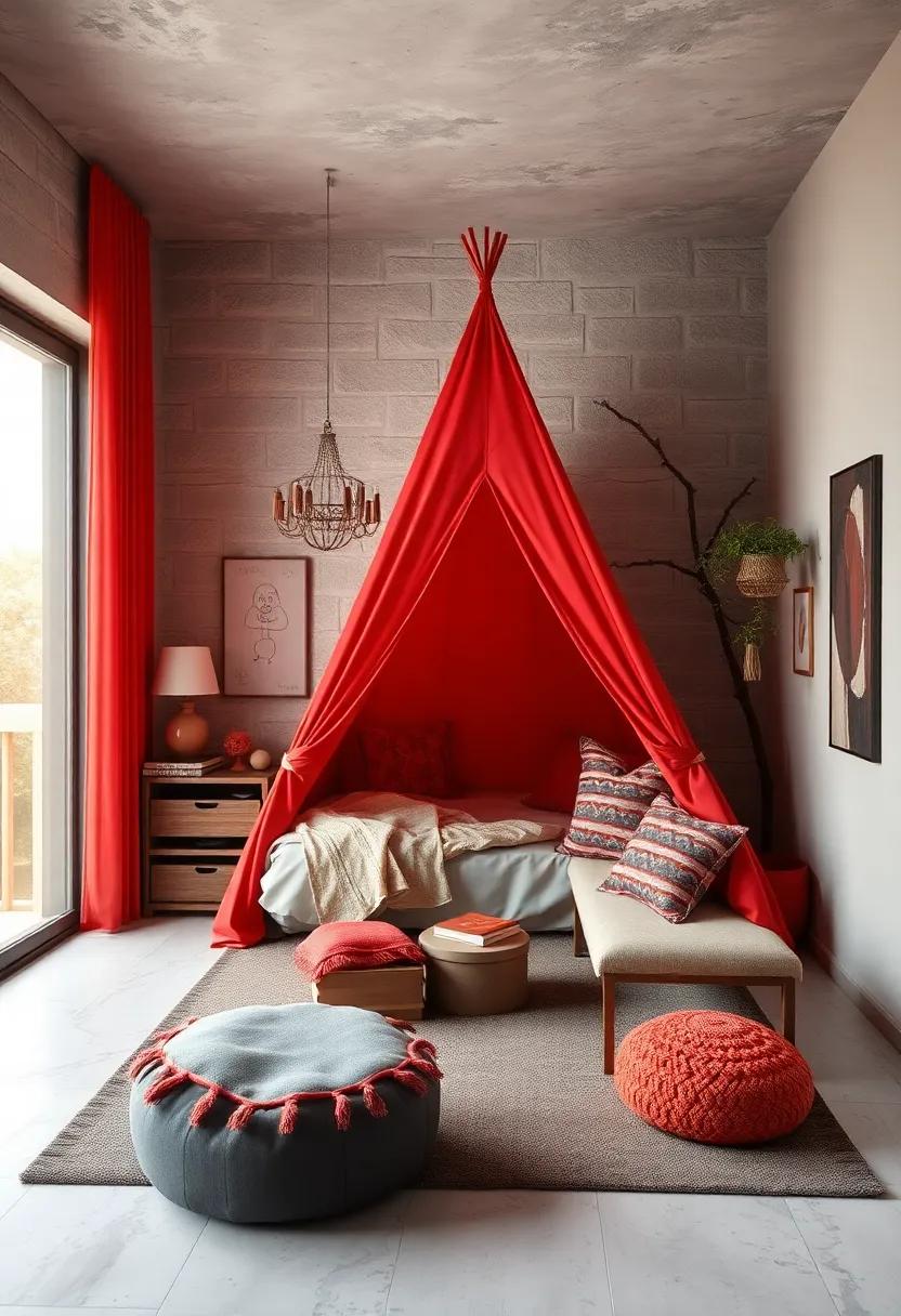 Transform a dull corner of the room into a vibrant hideaway by hanging a bold red tent or teepee. This playful addition not only enhances the aesthetics but also creates an enchanting space where young minds can embark on fantastic adventures.Encourage imaginative play by filling the tent with cozy cushions and soft blankets, allowing your child to role-play as intrepid explorers, courageous knights, or daring astronauts. The bright hue of red will ignite their creativity, making the space a dazzling focal point that draws them in time and again.