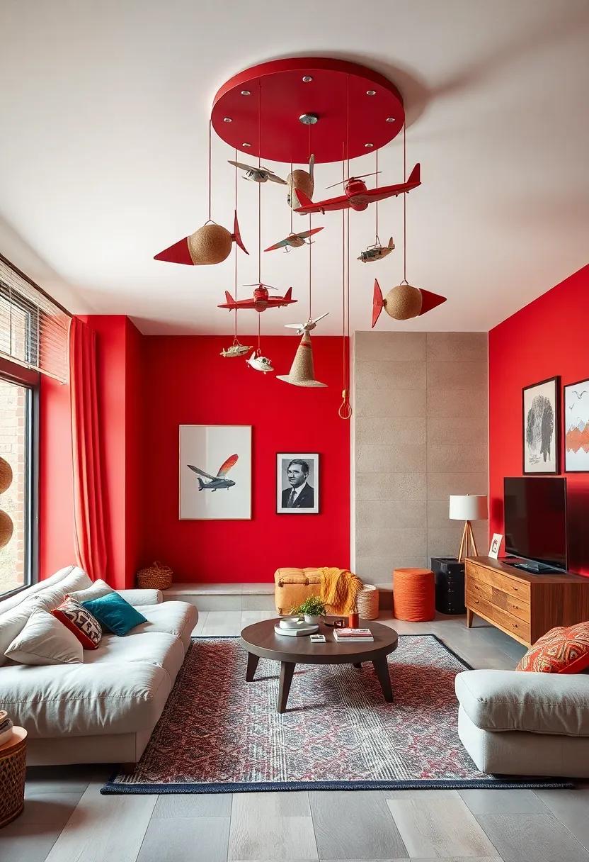 Transform the atmosphere of the room by suspending an enchanting collection of adventure-themed mobiles from the ceiling. These floating designs can include airplanes,hot air balloons,and zodiac constellations,which not only ignite imagination but also add a dynamic touch as they sway gently. Choose vibrant colors that complement the bold red walls, bringing together a playful spectrum that commands attention while sparking creativity.A well-placed mobile can serve as a captivating focal point, drawing the eye upward and encouraging exploration of the entire room.