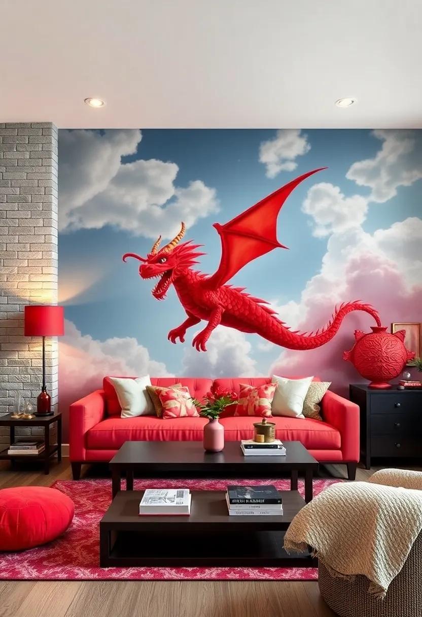 Transform the walls with an adventurous mural featuring a vibrant red dragon soaring through a majestic sky