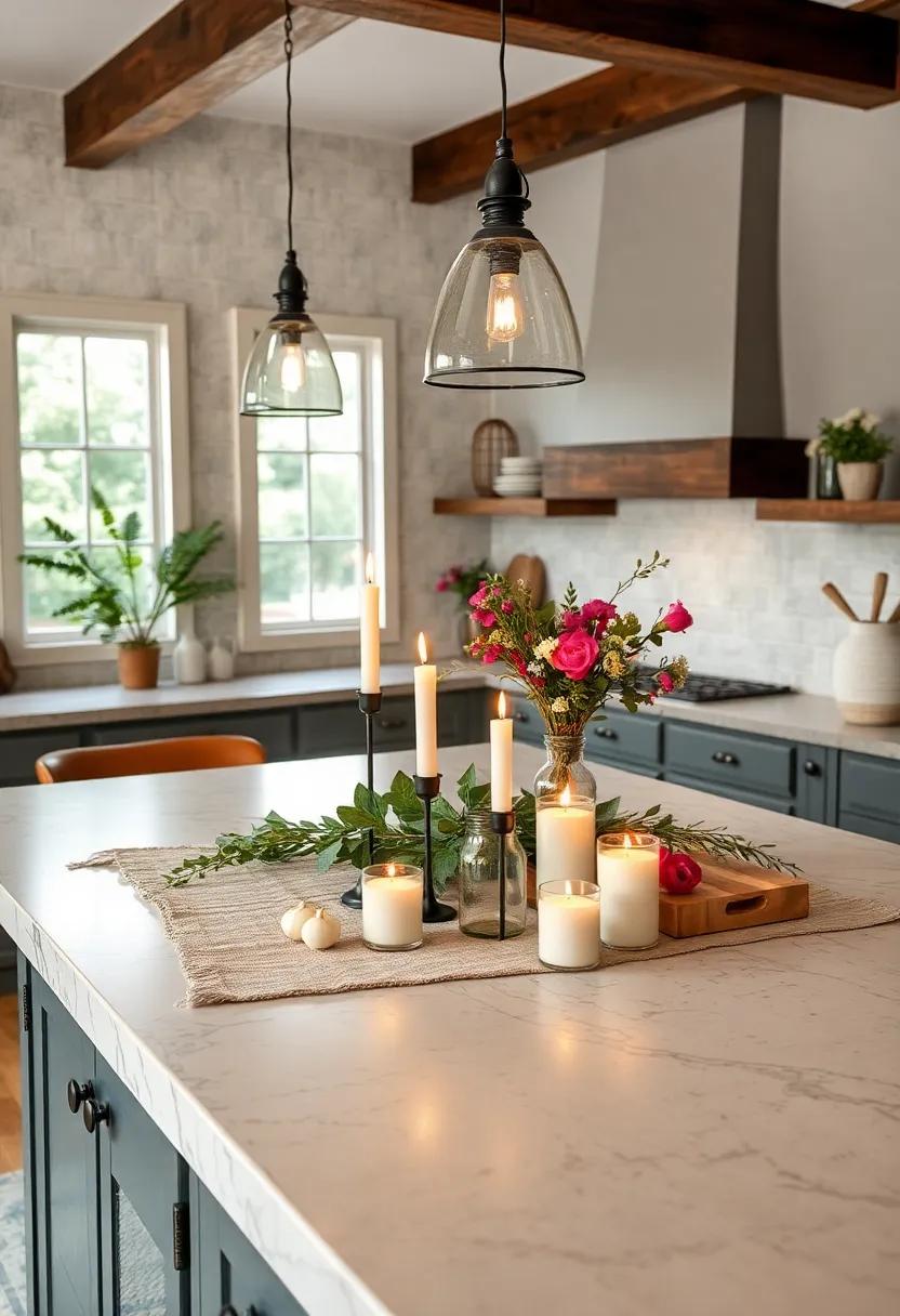 Transform your kitchen island into a cozy haven by incorporating an array of scented or decorative candles. Choose varying heights and styles to create an engaging visual focal point. For instance, group tall pillar candles at the center, flanked by smaller votives or tealights scattered around. This layered approach adds depth and interest to the arrangement, making it perfect for both everyday meals and festive gatherings. Opt for fragrances that complement your culinary creations; hints of vanilla or citrus can refresh the space while you cook.