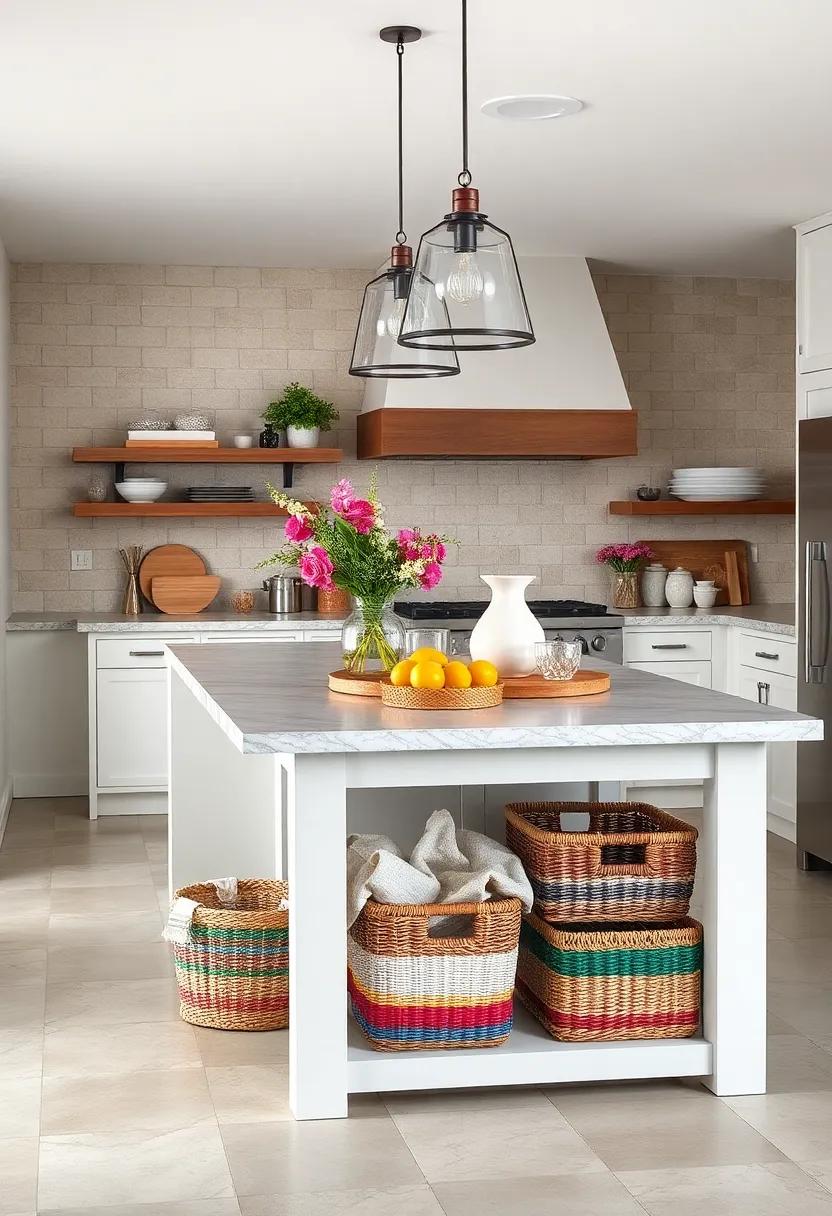 Colorful Baskets: Integrate colorful woven baskets as decorative storage options under your island to keep your space tidy while adding a splash of color