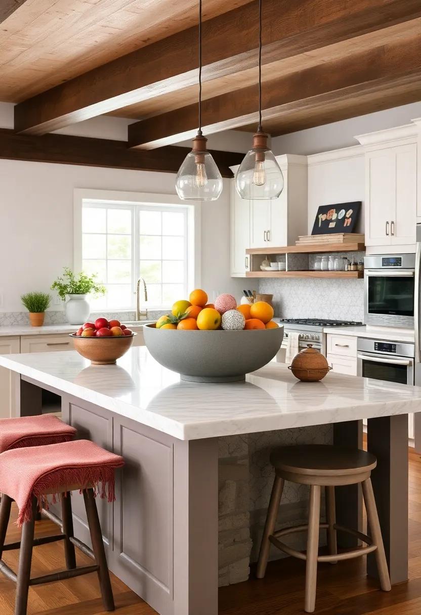Enhance the charm of your farmhouse kitchen island by integrating oversized decorative bowls that serve as captivating focal points. These bowls can be filled with an array of items that not only complement your kitchen’s aesthetic but also spark stimulating conversations. Consider using fresh fruits for a vibrant and organic touch. Their natural colors and textures can illuminate your space while offering a healthy snacking option. Alternatively, opt for potpourri filled with aromatic elements. this choice evokes a sensory experience, inviting guests to indulge in the delightful fragrances that waft through the air.
