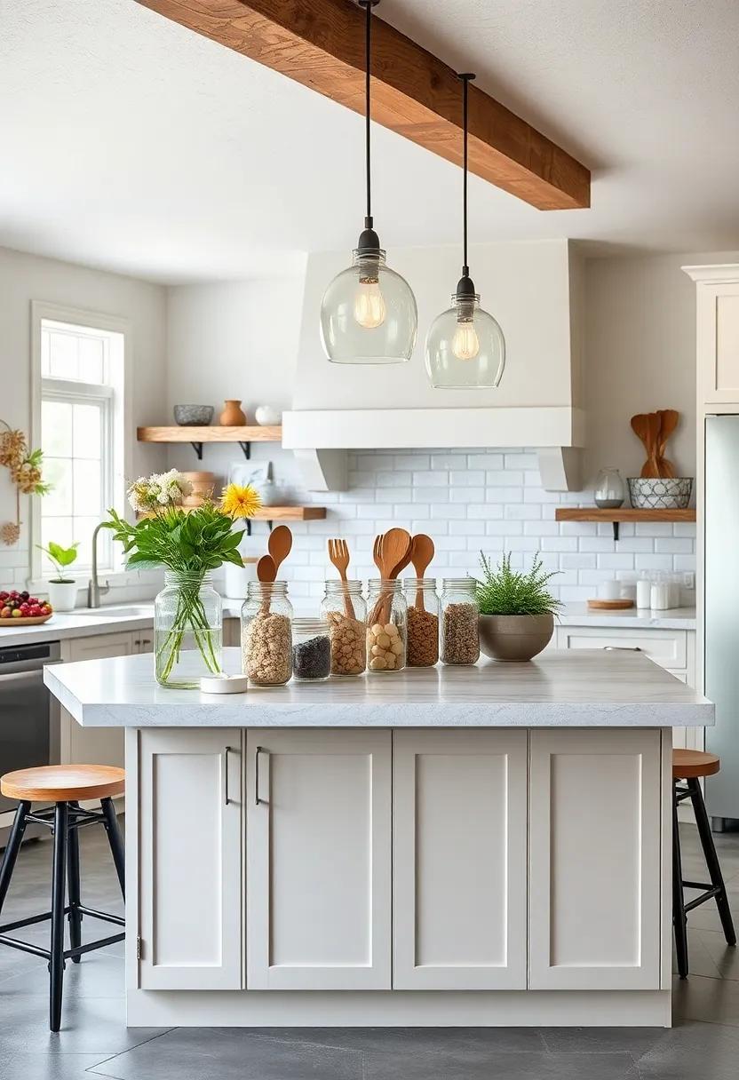 Transforming your kitchen island into a charming focal point can be as simple as incorporating mason jars filled with various dry goods and utensils. These iconic jars evoke a nostalgic farmhouse aesthetic while providing functional storage solutions. You can create a visually appealing display by grouping jars of different shapes and sizes, showcasing an array of options like: