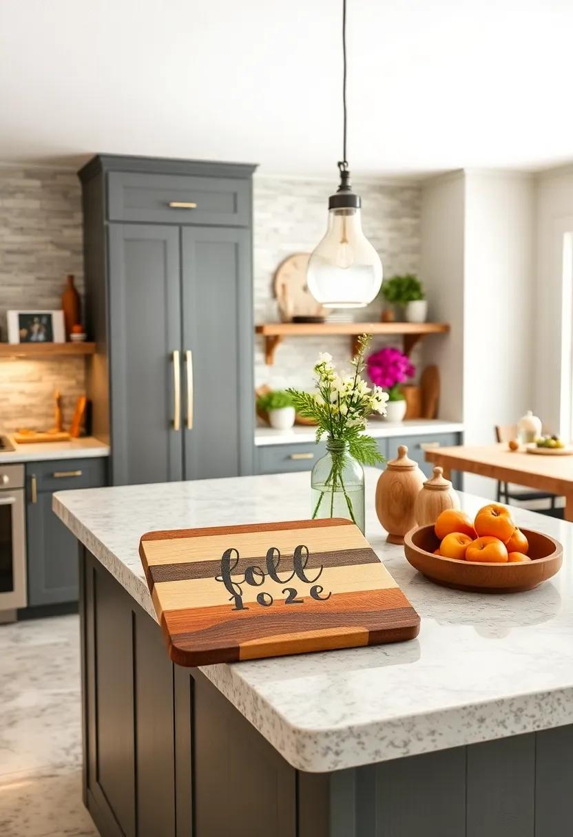 Adding a touch of personalization to your kitchen island can transform a functional space into a cozy gathering spot. Customized cutting boards serve as both practical tools and lovely decor pieces. Imagine displaying a beautifully crafted wooden board that proudly features your family name or a cherished date like a wedding anniversary.These boards not only emphasize your family’s identity but also evoke memories every time you prepare a meal. Opt for designs that complement the farmhouse aesthetic—consider rustic woods, elegant engravings, and natural finishes that blend seamlessly with your decor.