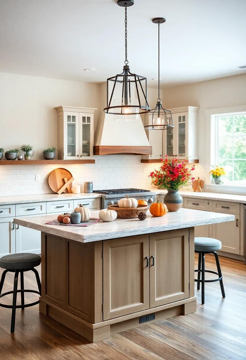 Embrace the magic of seasonal changes on your kitchen island by introducing decor that reflects the spirit of each season. In the autumn, elevate your space with clusters of pumpkins in various sizes and shades, along with rustic wooden crates. Incorporating elements like dried corn stalks and twinkling fairy lights can add a cozy touch, perfect for those crisp evenings.Winter offers an opportunity to bring the outdoors in; consider using pinecones, evergreen branches, and lanterns filled with soft candlelight to create a warm, inviting atmosphere. A small arrangement of holly and berries can serve as a festive centerpiece, making your kitchen feel like a holiday retreat.