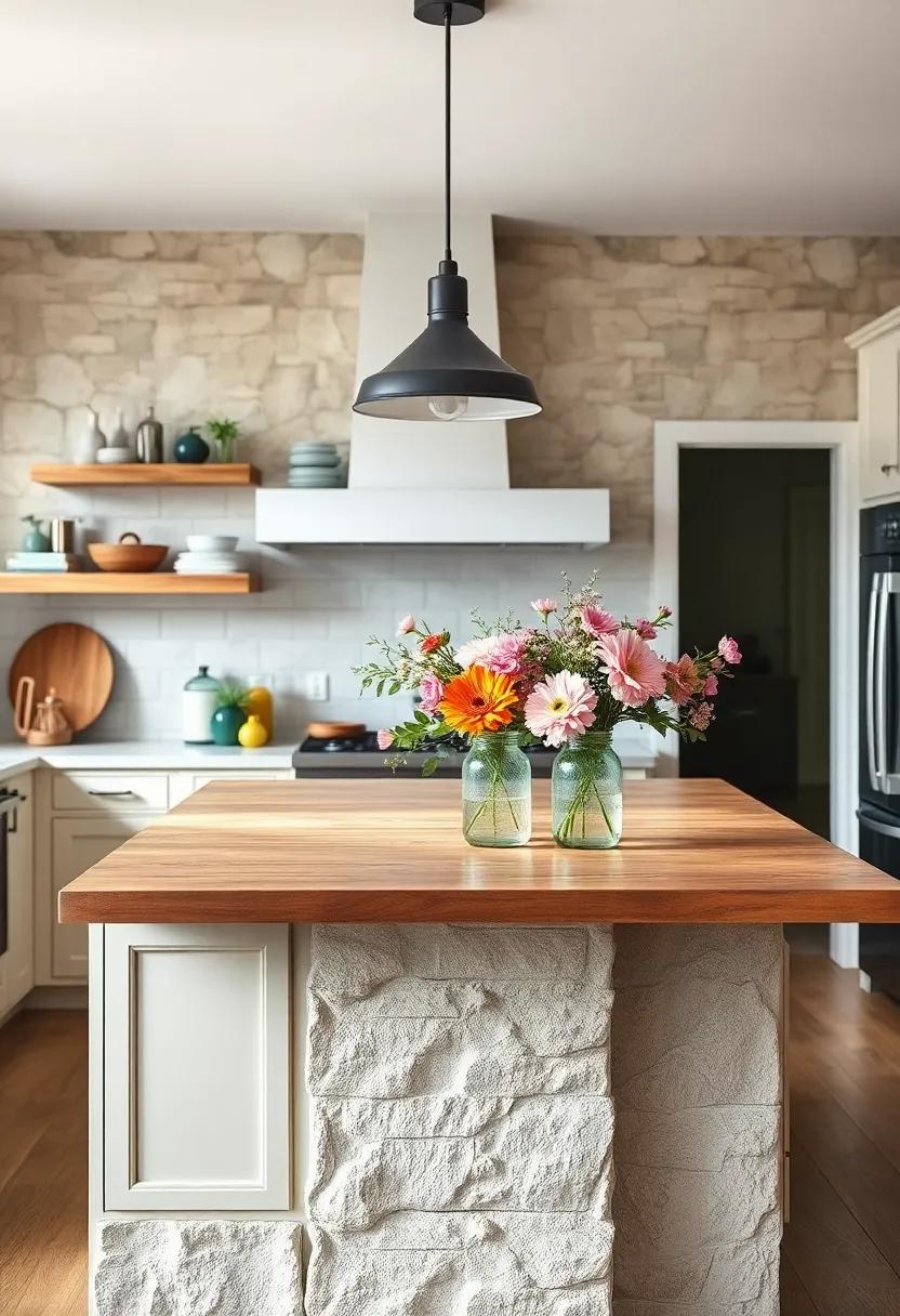 Simple Floral Arrangements: Keep it simple with a few blooms in a mason jar or jug to brighten your island, adding softness and a touch of nature indoors