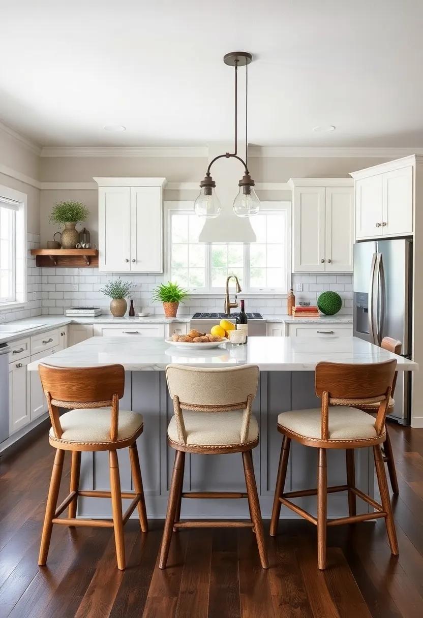 Using these elements in conjunction with the neutral tones of your island not only keeps your kitchen feeling fresh and inviting but also creates an elegant focal point that enhances the charm of farmhouse design.