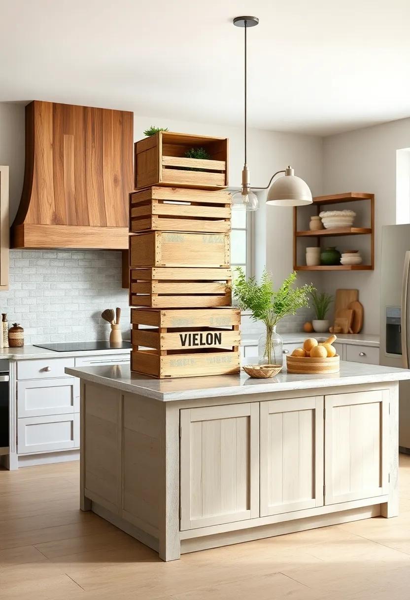 Incorporate different sizes and shapes of crates to create a dynamic display that captures the eye. Mixing wooden crates with other textures, such as soft linens or ceramic dishes, can enhance the farmhouse charm. For an extra touch, line the inside of your crates with burlap or patterned paper to add visual interest and depth. Don’t forget to include some decorative elements, such as potted plants or a vintage sign, on top of the crates to elevate the overall vibe. This approach not only optimizes your space but also invites a homey warmth that makes your kitchen island feel welcoming.
