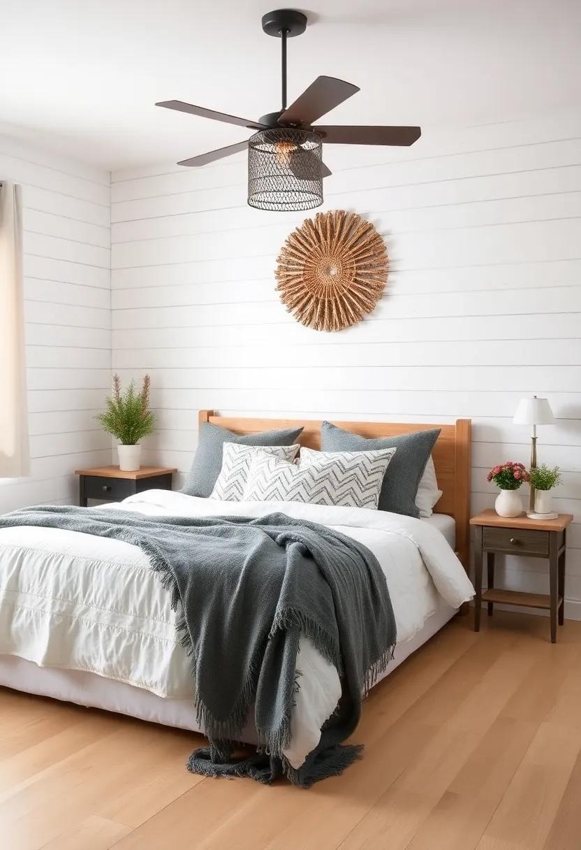 Adding shiplap to your farmhouse bedroom not only introduces a timeless aesthetic but also enriches the space with personality and warmth. This rustic element can be applied in various ways, whether as a feature wall, ceiling treatment, or even as accent decor for your furniture. The juxtaposition of painted or natural wood shiplap against soft furnishings and color palettes creates a harmonious blend of texture and style that embodies the farmhouse charm.