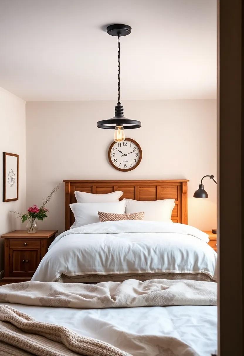 To elevate the charm of your farmhouse-inspired bedroom, consider integrating vintage-style pendant lights that serve as both functional and artistic focal points. These lights can cast a warm glow, creating a cozy atmosphere that complements rustic decor. Think about options such as: