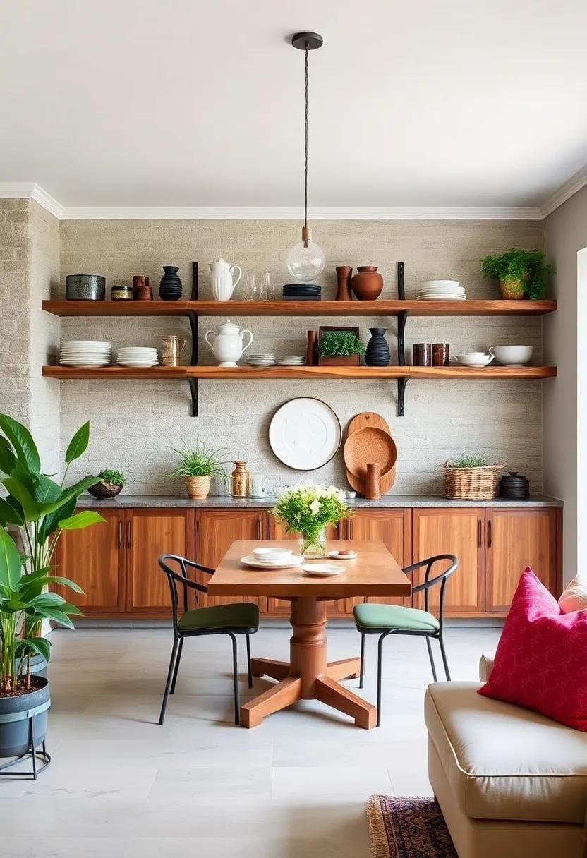 Consider choosing various shelf sizes and depths to create visual interest, and don’t hesitate to mix and match your collections. A well-placed herb basket can enhance the rustic appeal, while the vibrant colors of your dishware can brighten up the wood’s rich tones. Transform the mundane into the memorable by accentuating your shelves with personal touches, such as small potted plants or handmade ceramics. When styled well, these elements not only celebrate functionality but also become a canvas for your personality, making your dining area feel truly unique and inviting.