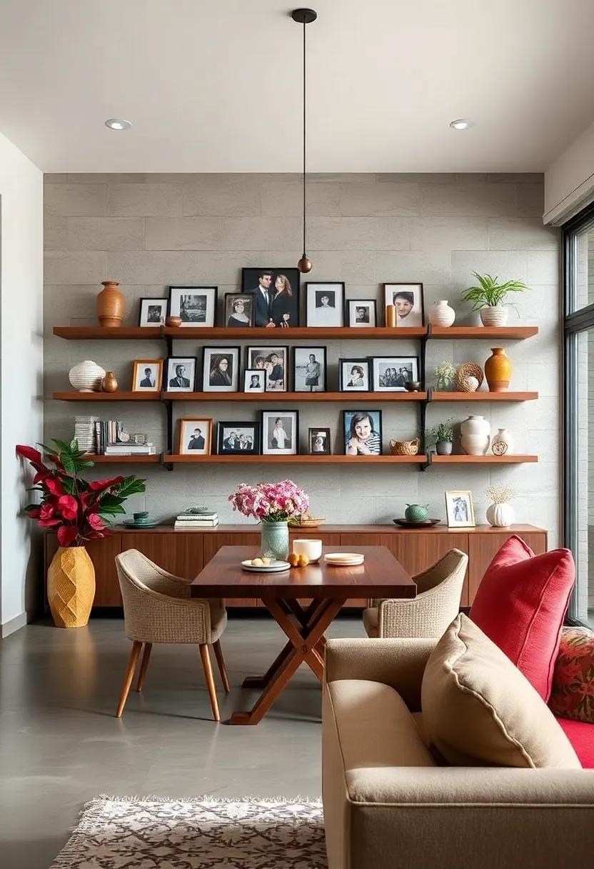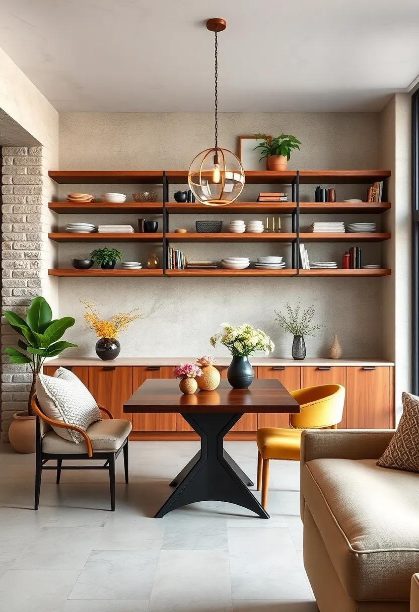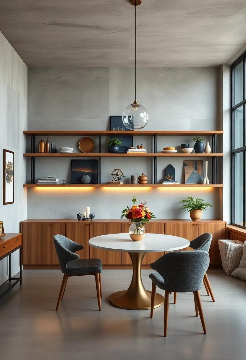 Transform your dining area into a captivating gallery by combining shelves of various sizes and materials. Imagine a rustic wooden shelf layered alongside a sleek metal one—each piece showcasing different facets of your life. You might want to display an old travel trunk as a base for a mid-century modern shelf above it, creating a visual story that reflects your adventures. mix-and-match ideas include: