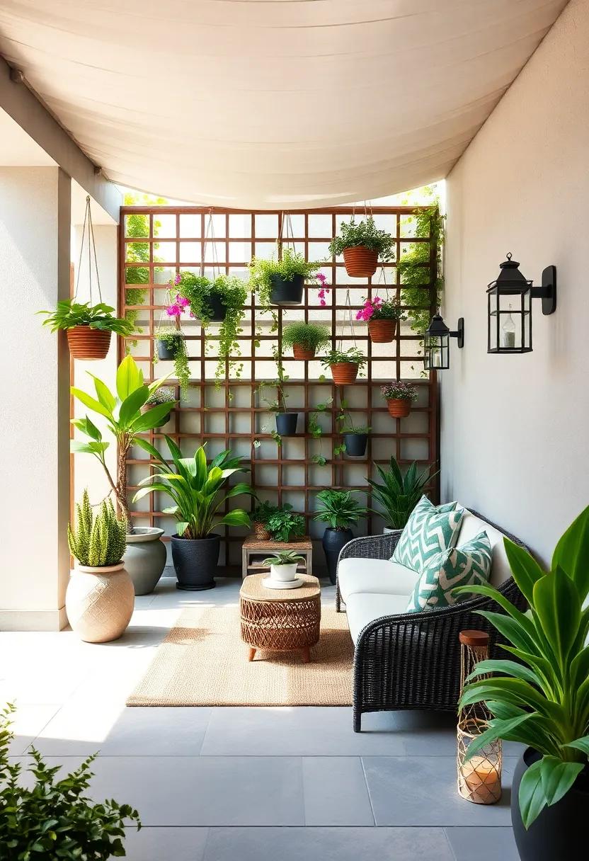 Garden Grid: Use a trellis as a backdrop for hanging plants; this adds structure and allows climbing plants to flourish while enhancing your patio’s aesthetics