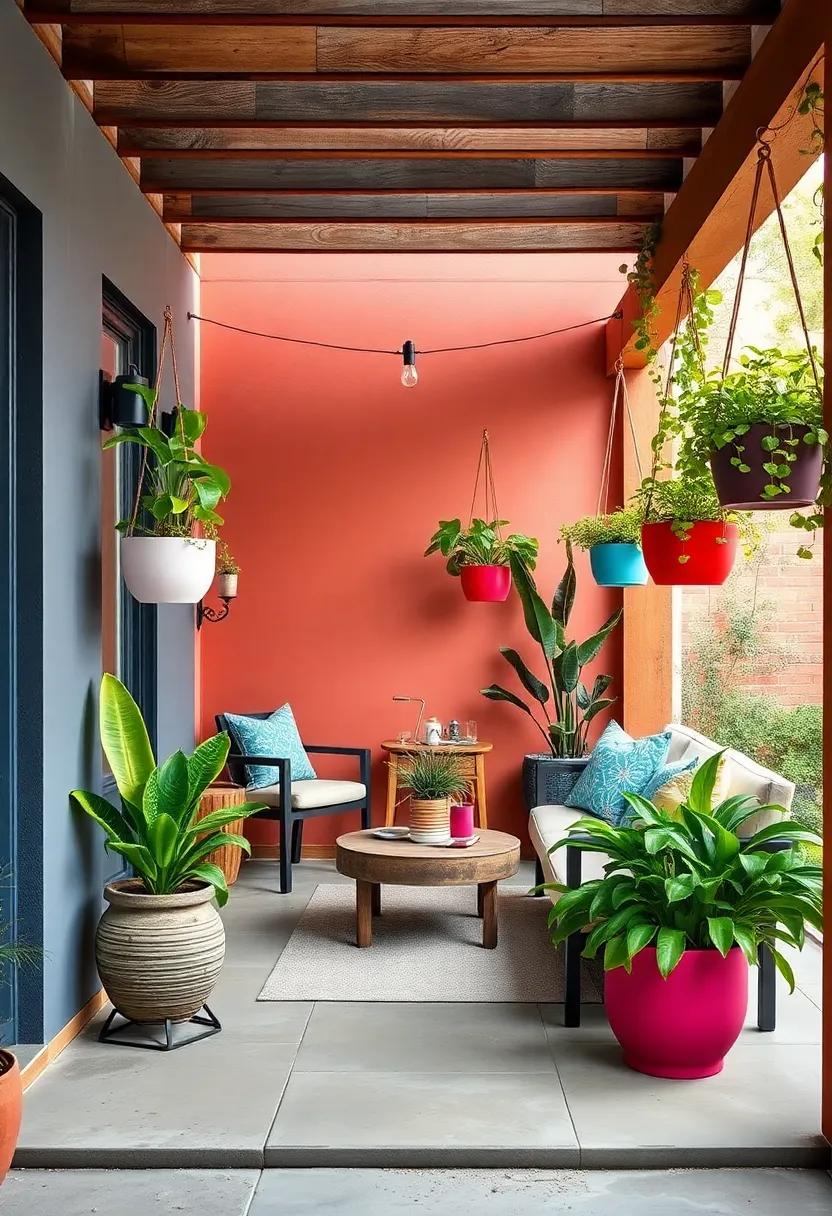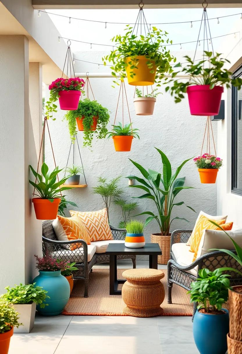 Colorful Planter Pots: Choose brightly colored hanging planter pots to create a cheerful atmosphere; mix and match colors for added fun