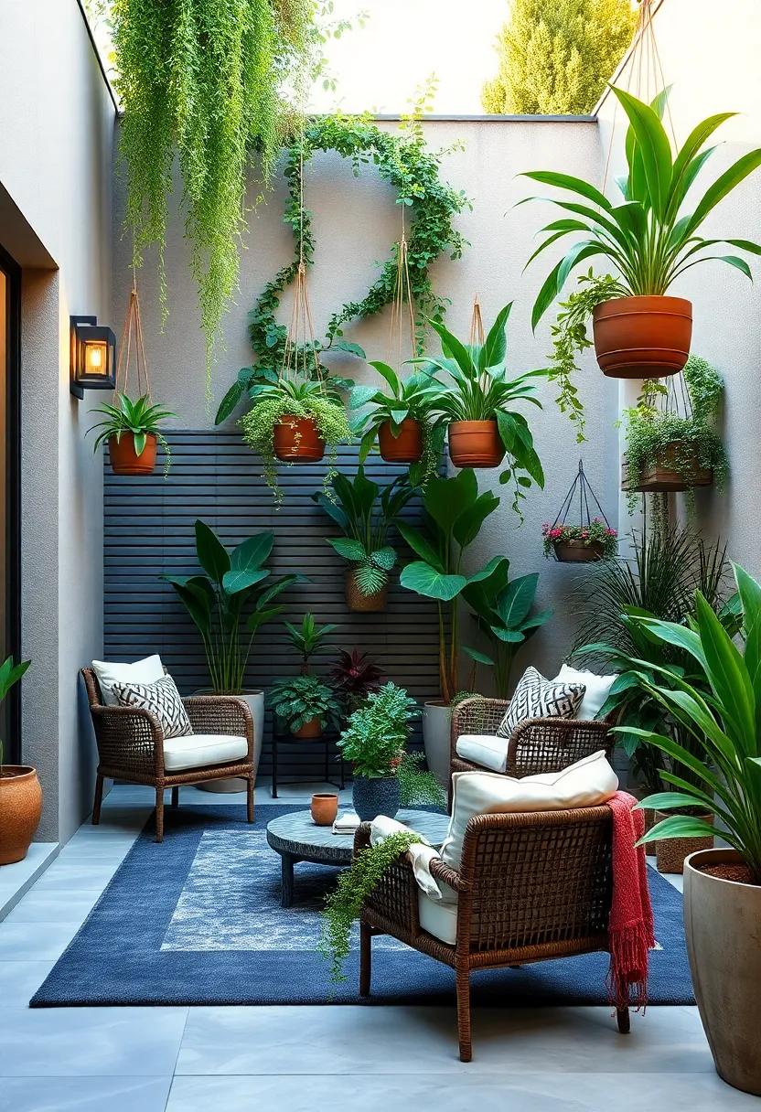 To elevate this hangout vibe, think about incorporating a cozy seating arrangement beneath your green canopy. A pair of compact, cushioned chairs or a hammock would be perfect for unwinding amidst the cascading flora. Adding string lights or small lanterns within your arrangement can infuse warmth and create an inviting ambiance, making the hangout a perfect spot for late-night conversations or a serene solo moment with a book. By thoughtfully designing this plant sanctuary, you craft a serene escape that enhances both the aesthetics and enjoyment of your outdoor living area.