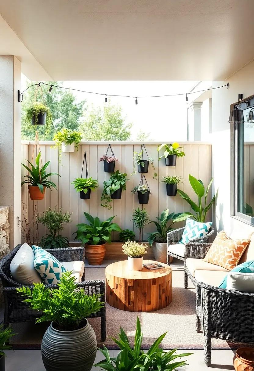 Transform your small patio into a dreamy oasis by curating a special area dedicated to hanging planters. Group several planters of varying sizes and shapes to create an enchanting, layered effect that celebrates the beauty of greenery. Consider using a mix of cascading plants, such as string of hearts and trailing ivy, intertwined with colorful flowering varieties like petunias or fuchsias. This blend not only enhances visual appeal but also brings a vibrant atmosphere to small spaces, allowing you to escape into a lush, jungle-like retreat right at home.