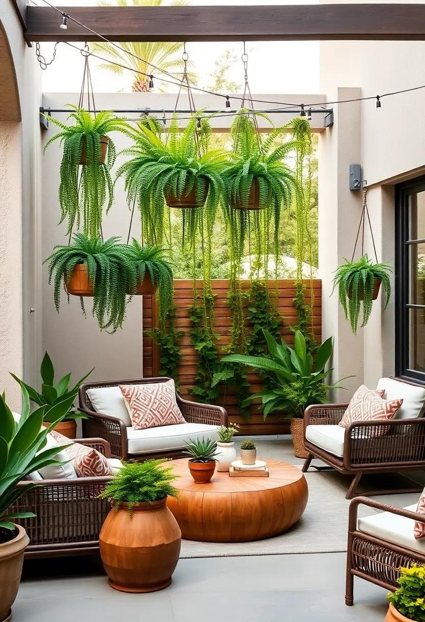 Embrace Verticality: Transform your small patio into a green oasis by utilizing wall-mounted hanging planters that draw the eye upward and introduce depth