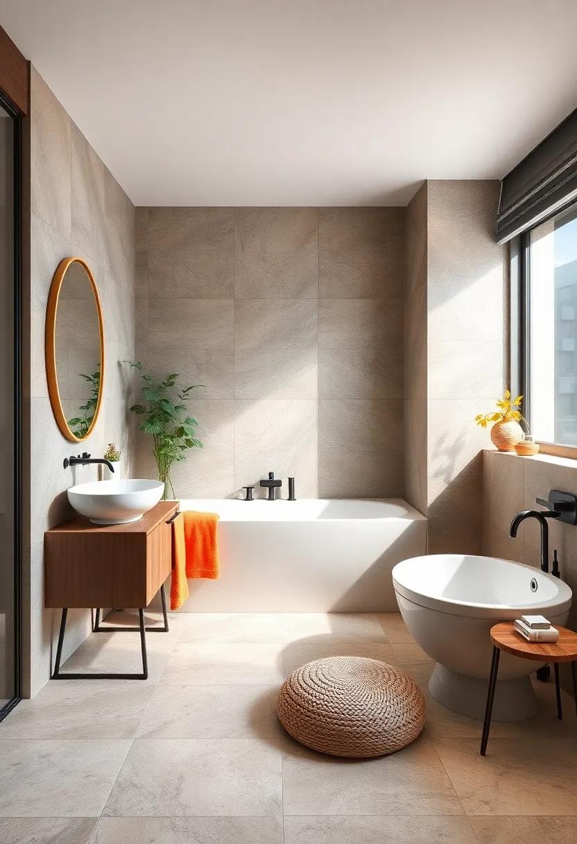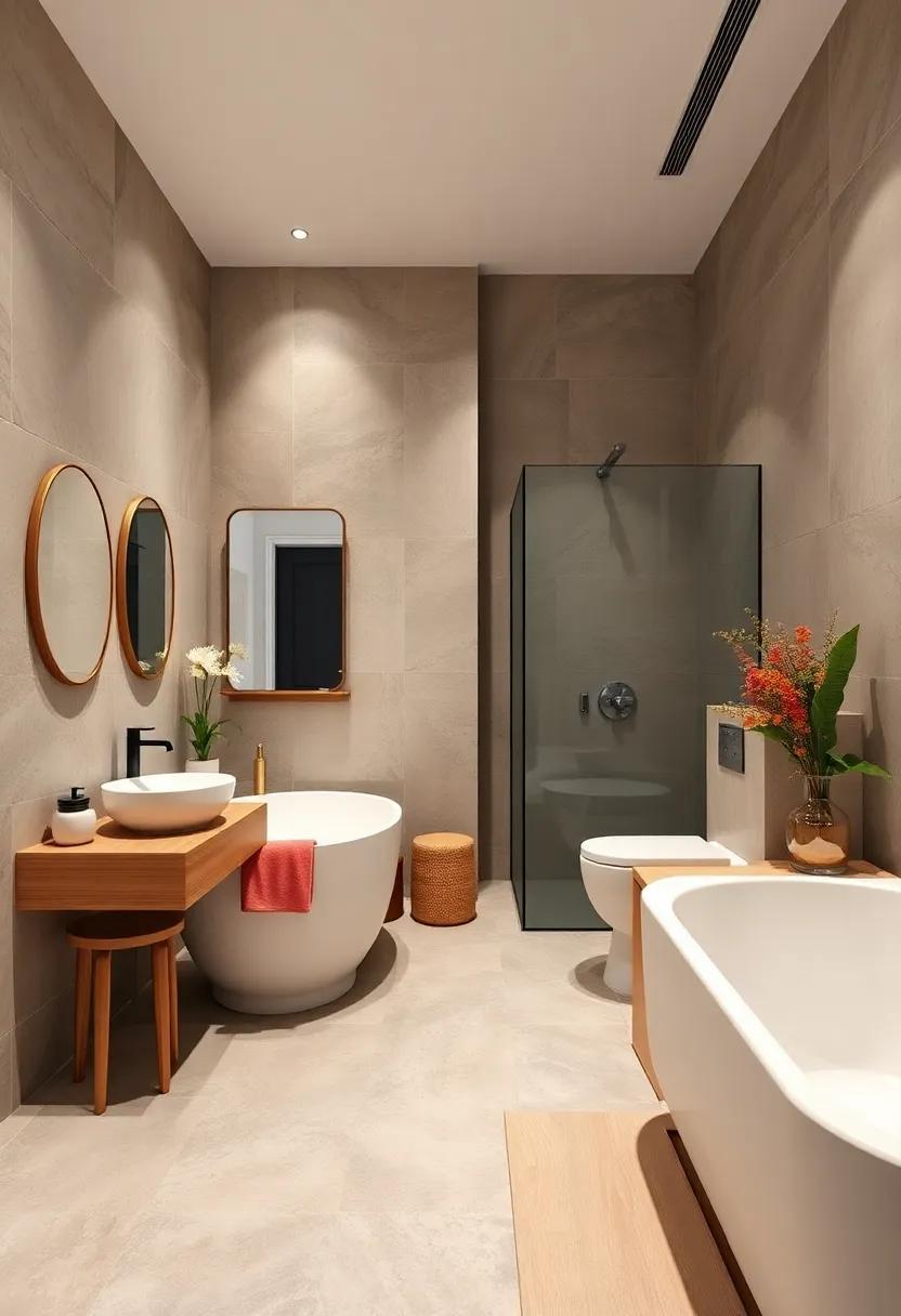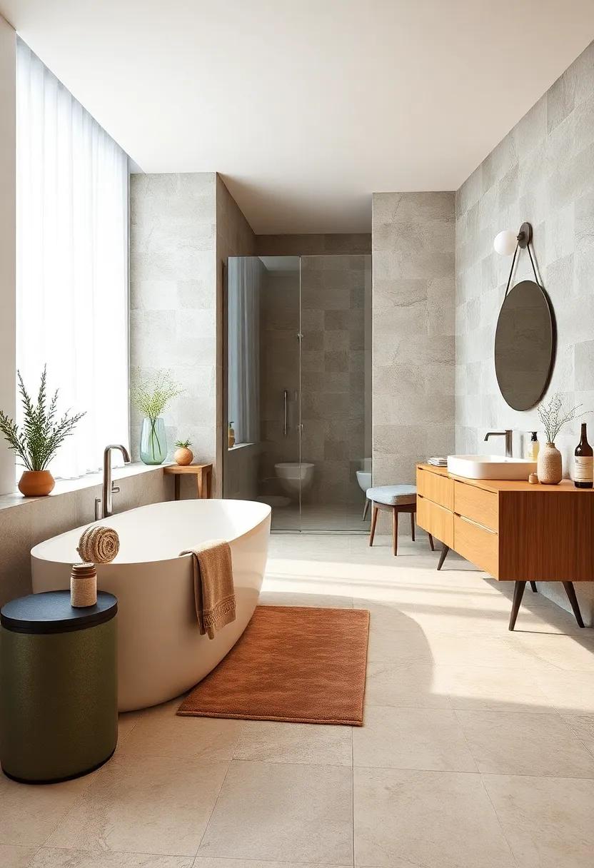 Incorporating vintage accents into your bathroom decor can create a stunning contrast with modern elements. One of the most effective ways to achieve this blend is by using retro mirrors. Consider a vintage sunburst mirror or a distressed frame that can act as a statement piece above your sink or vanity. These pieces not only reflect light, enhancing the space, but also add a nostalgic charm that softens sleek, contemporary lines.You can pair these mirrors with modern fixtures for an eye-catching balance, or place complementary accessories around them to unify the overall aesthetic.