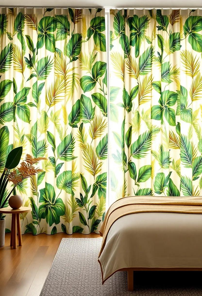Transform your bedroom into a serene tropical oasis with curtain fabrics adorned in lush leaf patterns. These prints not only evoke a sense of vacation nostalgia but also bring a vibrant energy into your space. Choose curtains that feature elegant pleats to add dimension and a sophisticated flow to the design. The interplay of lush greens and dynamic textures captures the essence of nature while providing a comforting backdrop that feels alive and inviting.