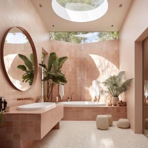 This spa-like bathroom combines gentle blush tiles with a dramatic skylight that floods the room with natural light. A curved shower wall serves as a calming centerpiece, while lush greenery adds a tropical touch. Earthy textures like woven stools and potted plants ground the space in peaceful luxury.