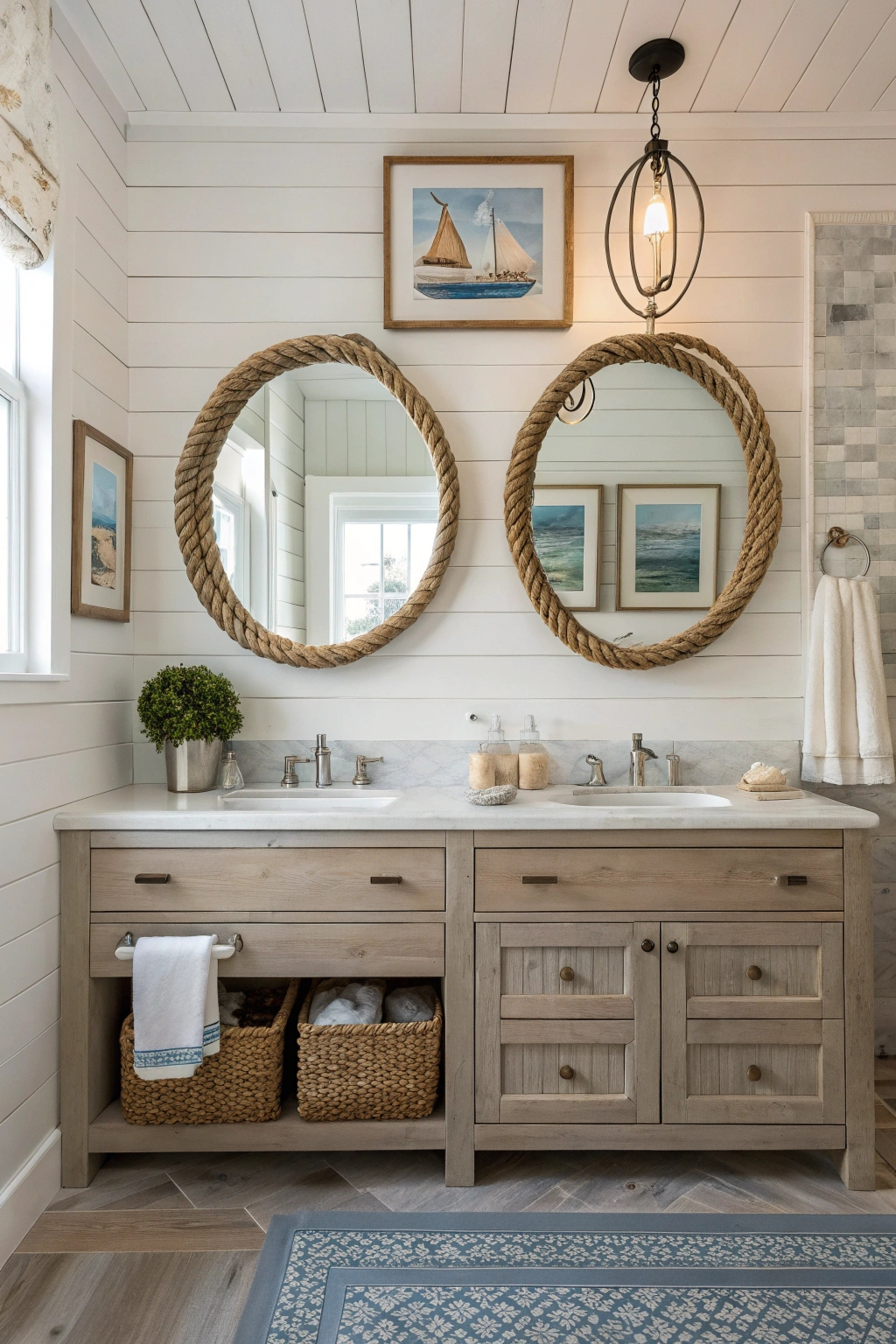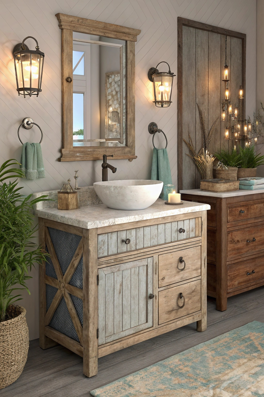 A rustic vanity serves as a captivating centerpiece, infusing your bathroom with vintage charm and nautical flair.