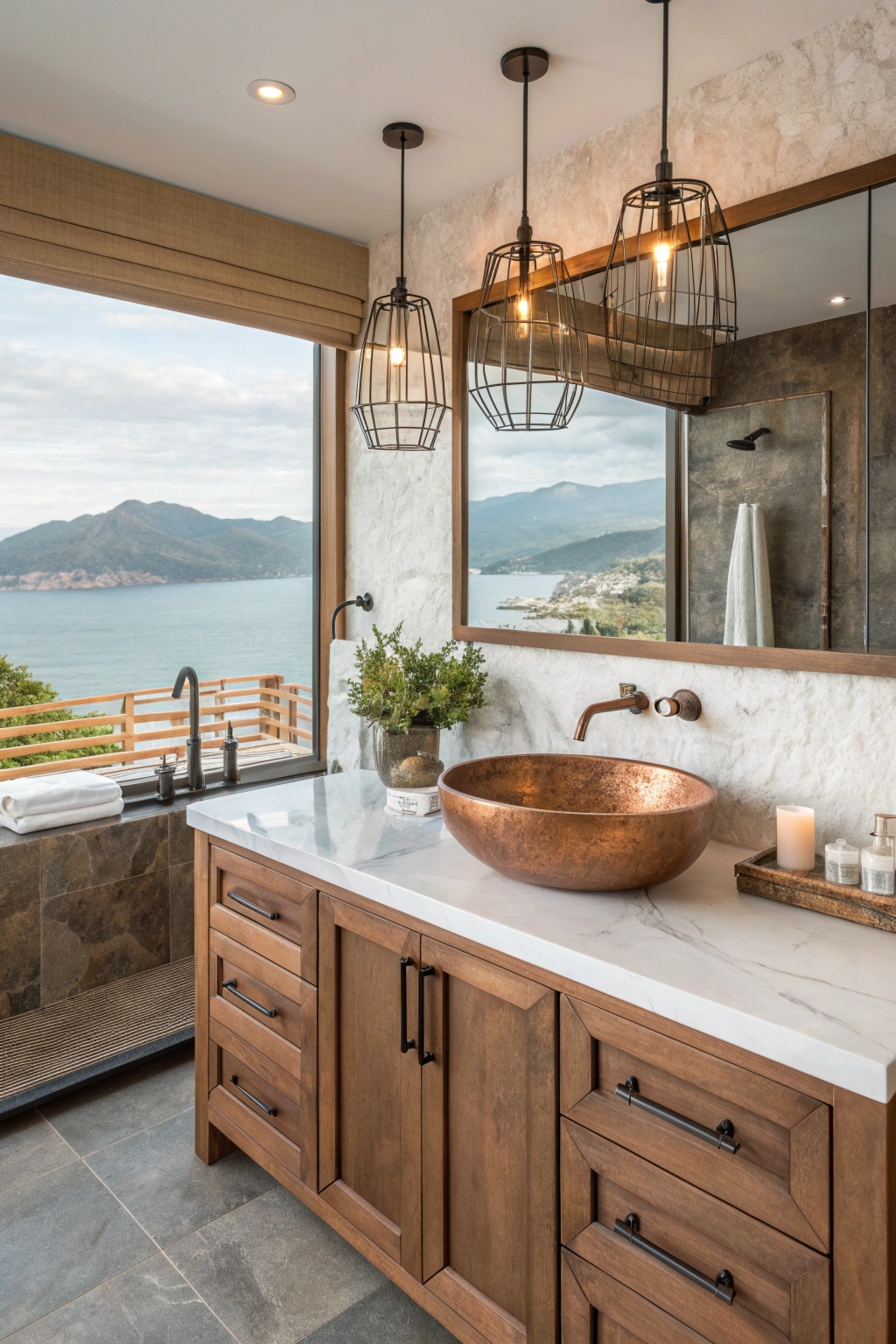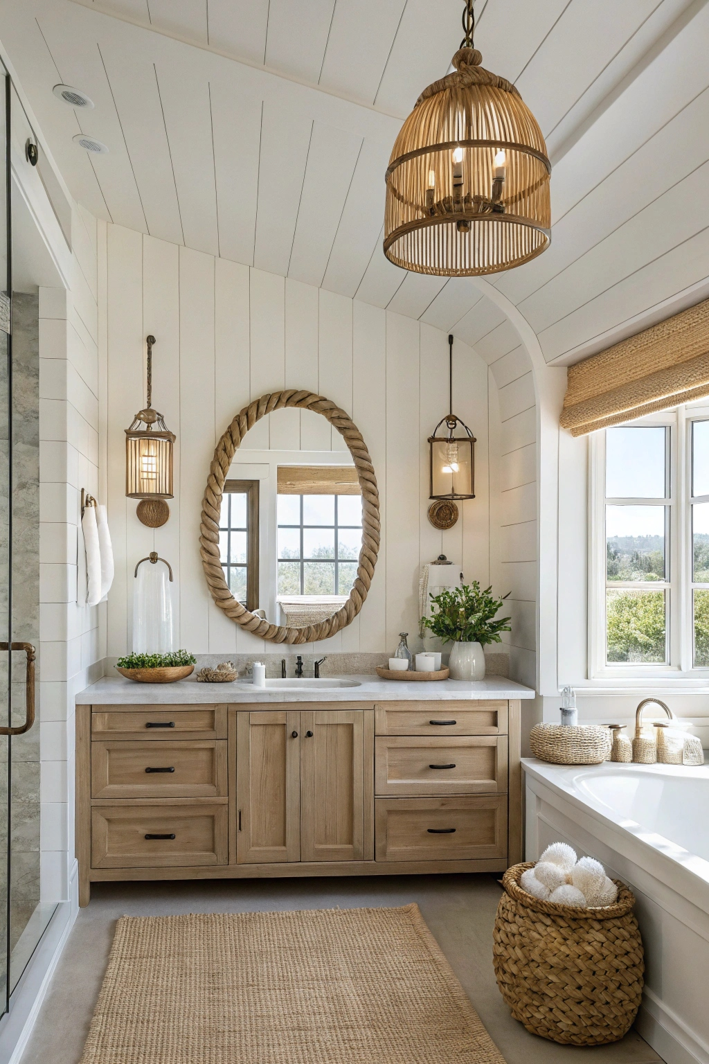 Lighting dramatically influences your bathroom’s ambiance. Fixtures inspired by coastal elements can enhance the theme and add warmth.