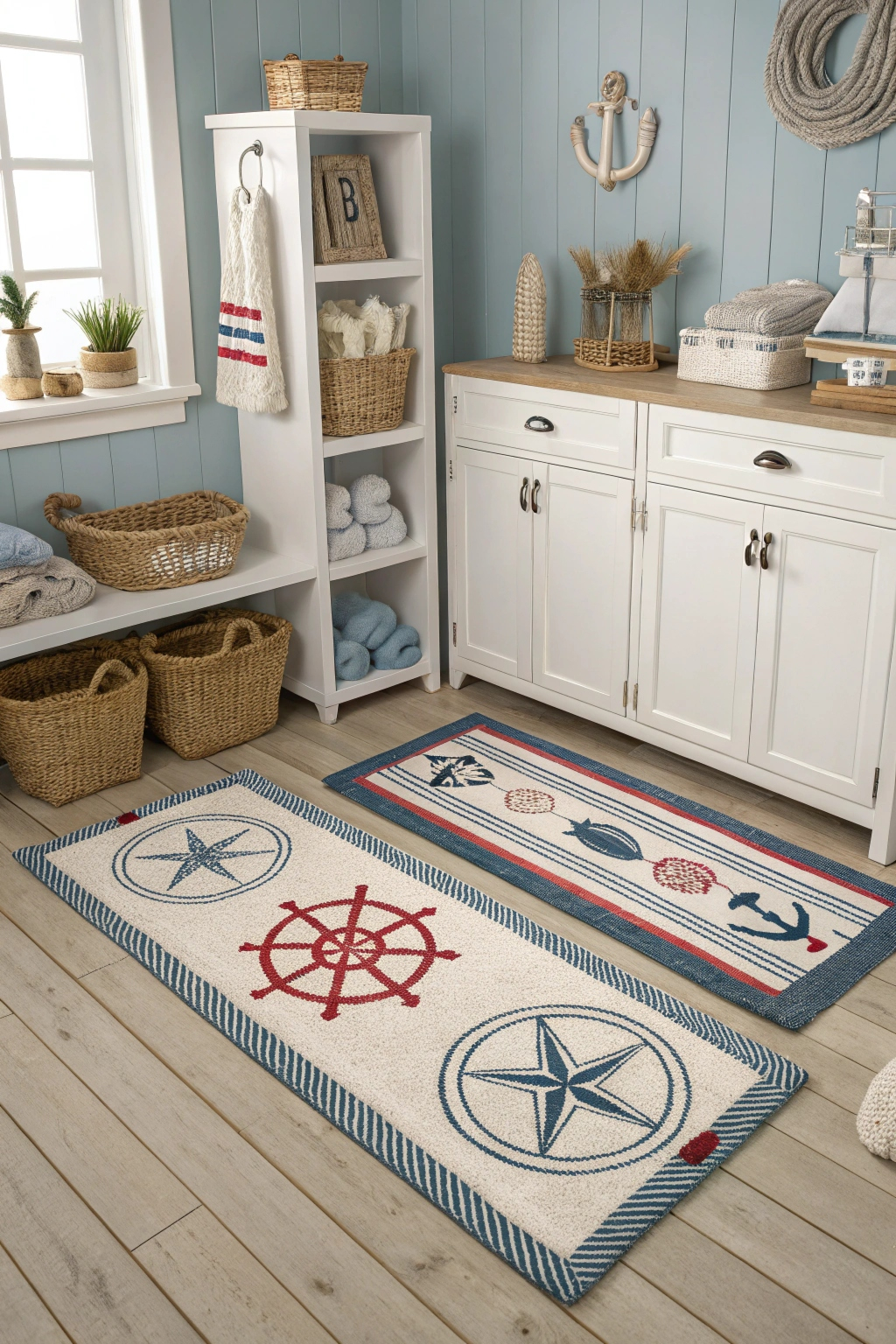Natural fibers like cotton or jute are durable and align with coastal aesthetics. Patterns featuring anchors, stripes, or seashells add thematic interest. For a polished look, consider coordinating your rugs with other textiles.