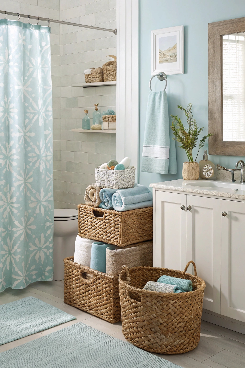 Wicker baskets and canvas bins are excellent for storing towels and toiletries, keeping your bathroom neat and adding natural texture.